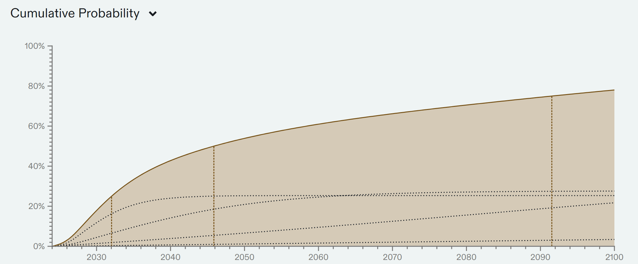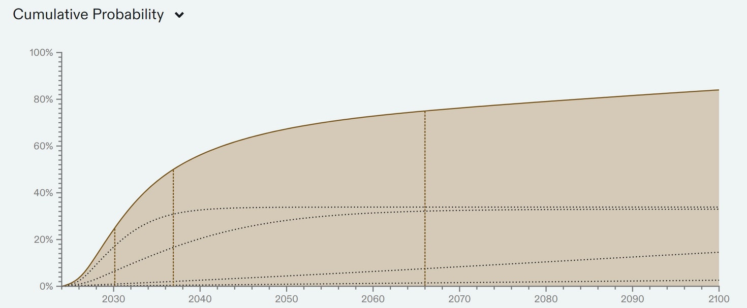 Year P(TAI < Year) 2030 18% 2035 34% 2040 43% 2043 47% 2045 50% 2050 54% 2060 61% 2070 66% 2080 71% 2090 74% 2100 78%