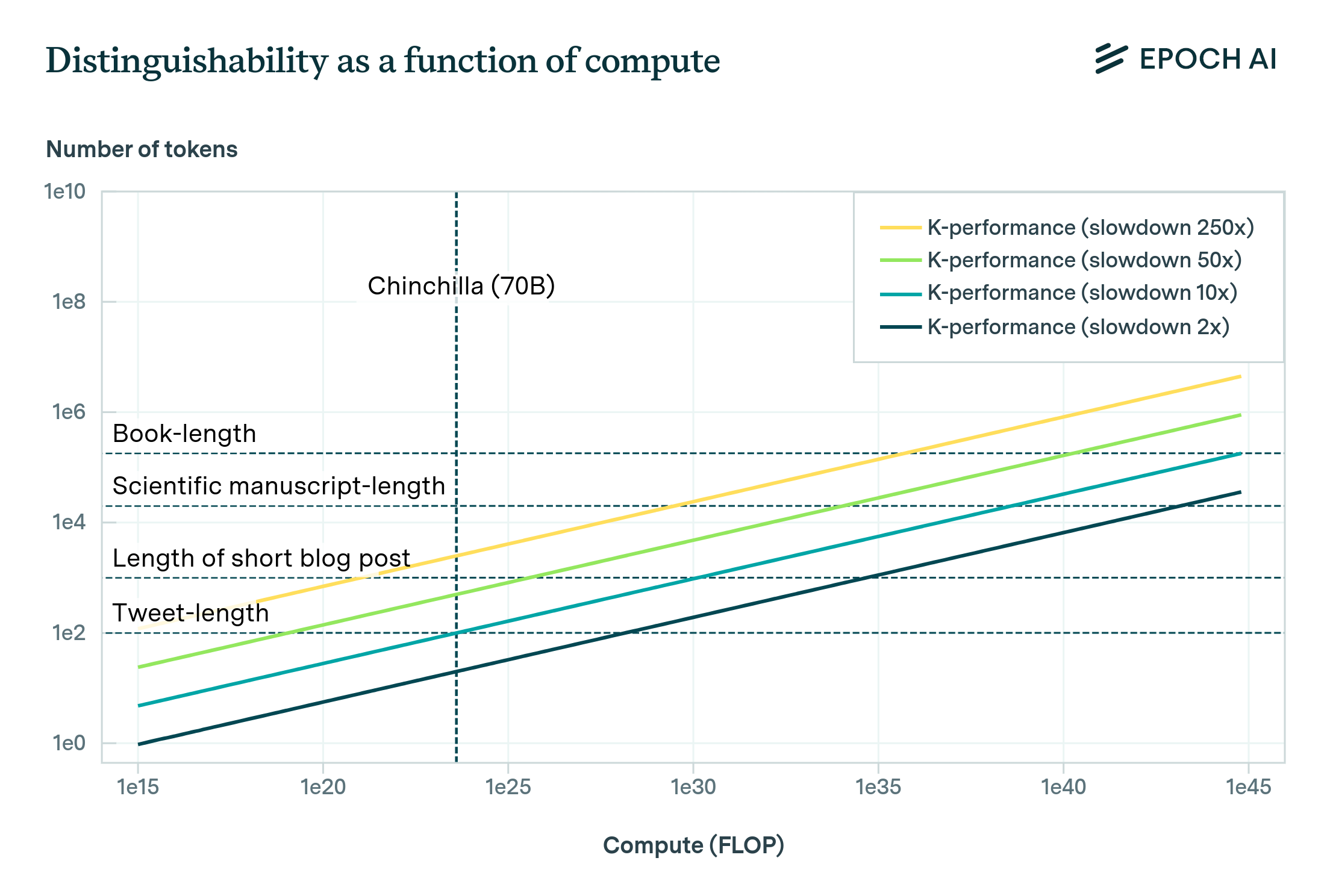 These results can be summarized in the following plot, which shows how distinguishability evolves as a function of compute, given 2022 algorithms. The two essential parameters are (1) the horizon length over which you think language models must be capable of performing reliable high-quality reasoning before they can automate intellectual labor, and (2) the ability of humans to discriminate between outputs relative to an ideal predictor (called the “slowdown” parameter), which sets a bound on how good humans are at picking out “correct” results. Very roughly, lower estimates in the slowdown correspond to thinking that model outputs must be indistinguishable according to a more intelligent judge in order for the model to substitute for real humans, with slowdown=1 being an ideal Bayesian judge.