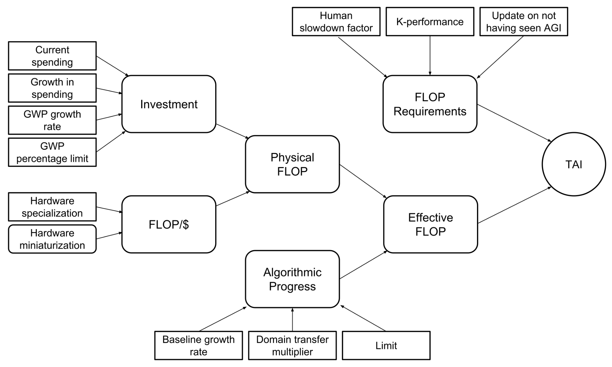 If compute is the central driving force behind AI, and transformative AI (TAI) comes out of something looking like our current paradigm of deep learning, there appear to be a small set of natural parameters that can be used to estimate the arrival of TAI. 1 These parameters are: