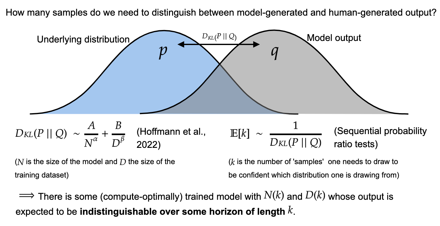 With some further mathematical assumptions, we can use scaling laws to calculate how many tokens it will take, on average, to distinguish between model-generated outputs and outputs in the training distribution, up to some desired level of confidence. 5