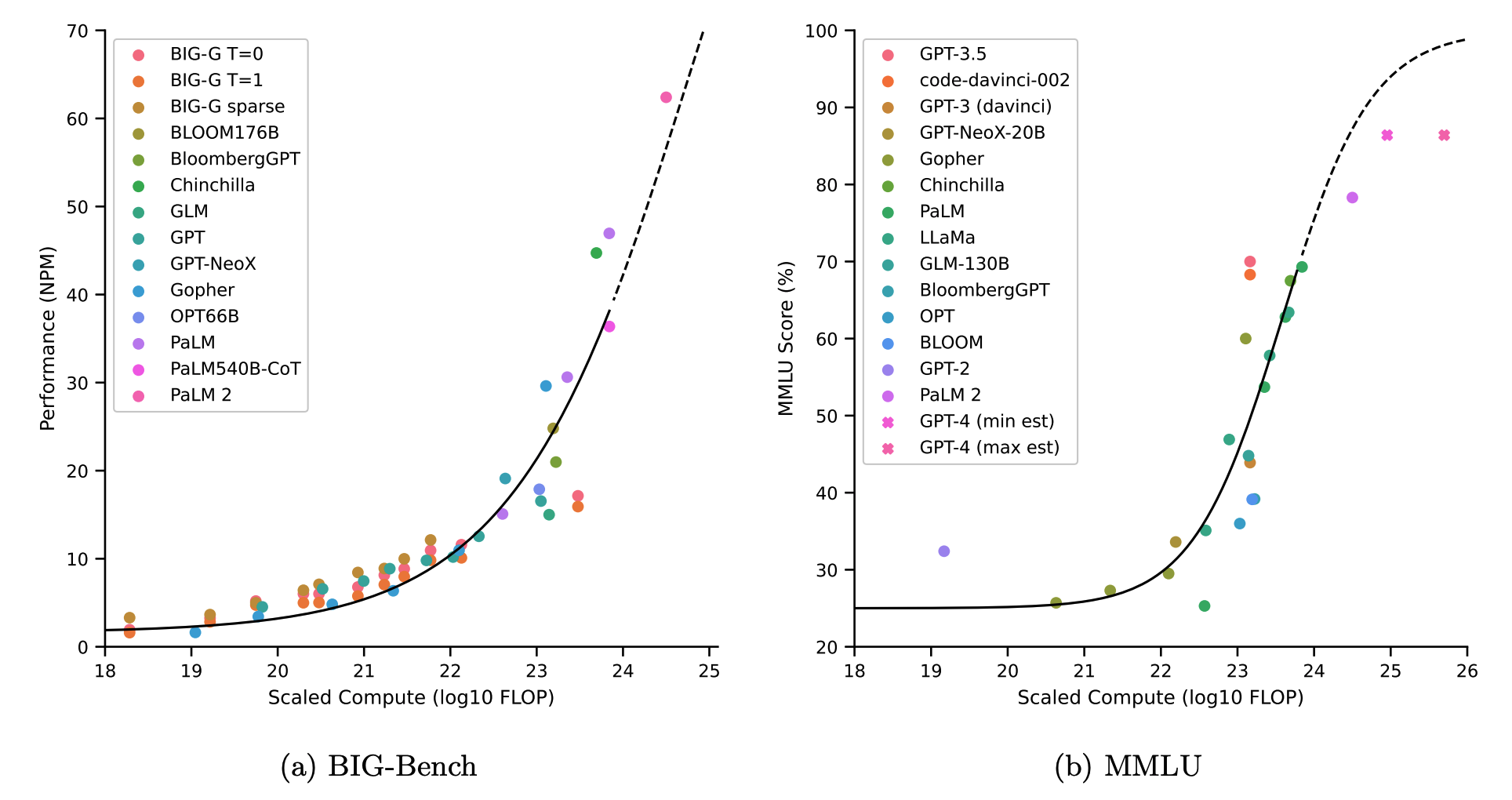 Aggregate benchmark performance is fairly predictable from scale. Graph from Owen 2023.