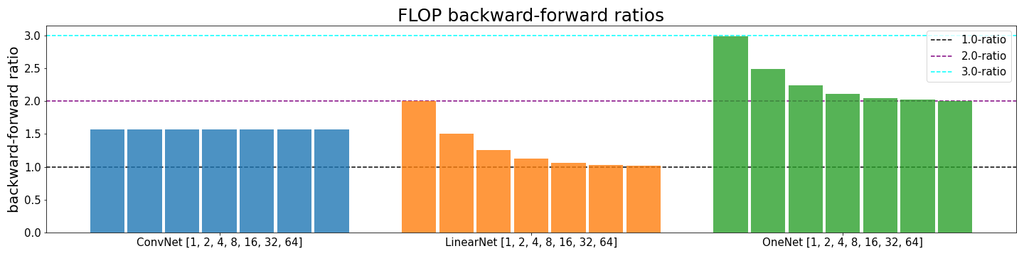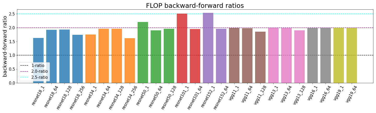 - Classic settings, i.e. deep networks with convolutional layers and large batch sizes, almost always have backward-forward FLOP ratios close to 2:1.