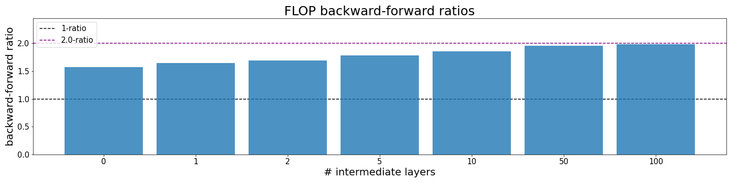 - Depth: The first layer has a backward-forward ratio of 1:1 while all others have 2:1. Therefore, the overall ratio is influenced by the fraction of FLOP in first vs. FLOP in other layers.