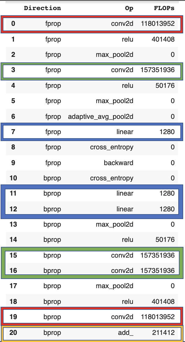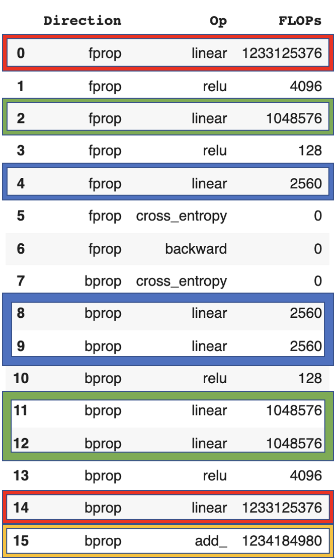 We can see that the first layer (red) has the same flop count for forward and backward pass while the other layers (blue, green) have a ratio of 2:1. The final weight update (yellow) is 2x the number of parameters of the network.