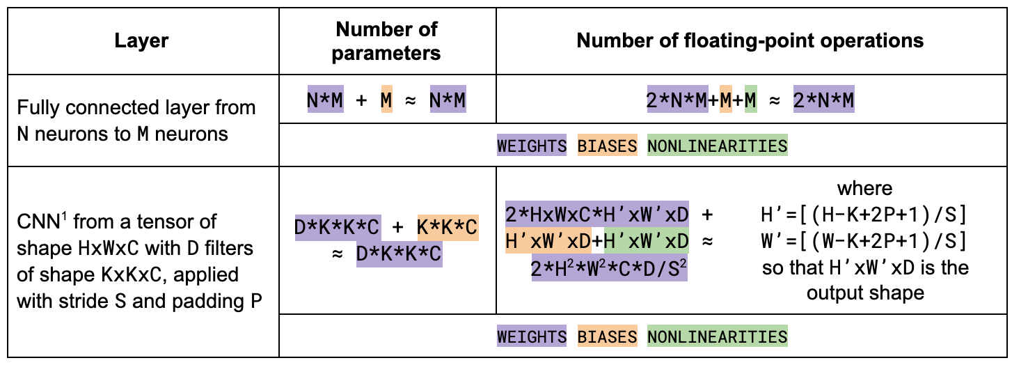 - We assume the network is being optimized by stochastic gradient descent (w += ɑ⋅dw) and count the weight update as part of the backward pass. Other optimizers would imply different FLOP counts and could create ratios even larger than 3:1 for niche settings (see appendix B). However, the ratio of 2:1 in the classic setting (see point 1) should still hold even when you use momentum or Adam.