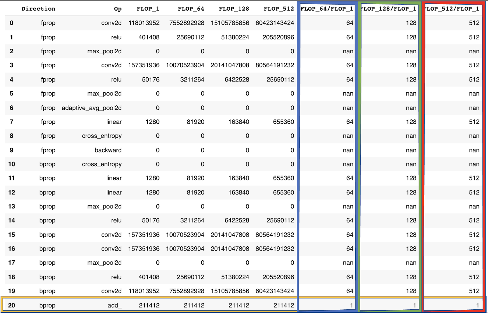 To corroborate our analysis we use NVIDIA’s pyprof profiler to audit the amount of FLOP in each layer during the backward and forward pass.