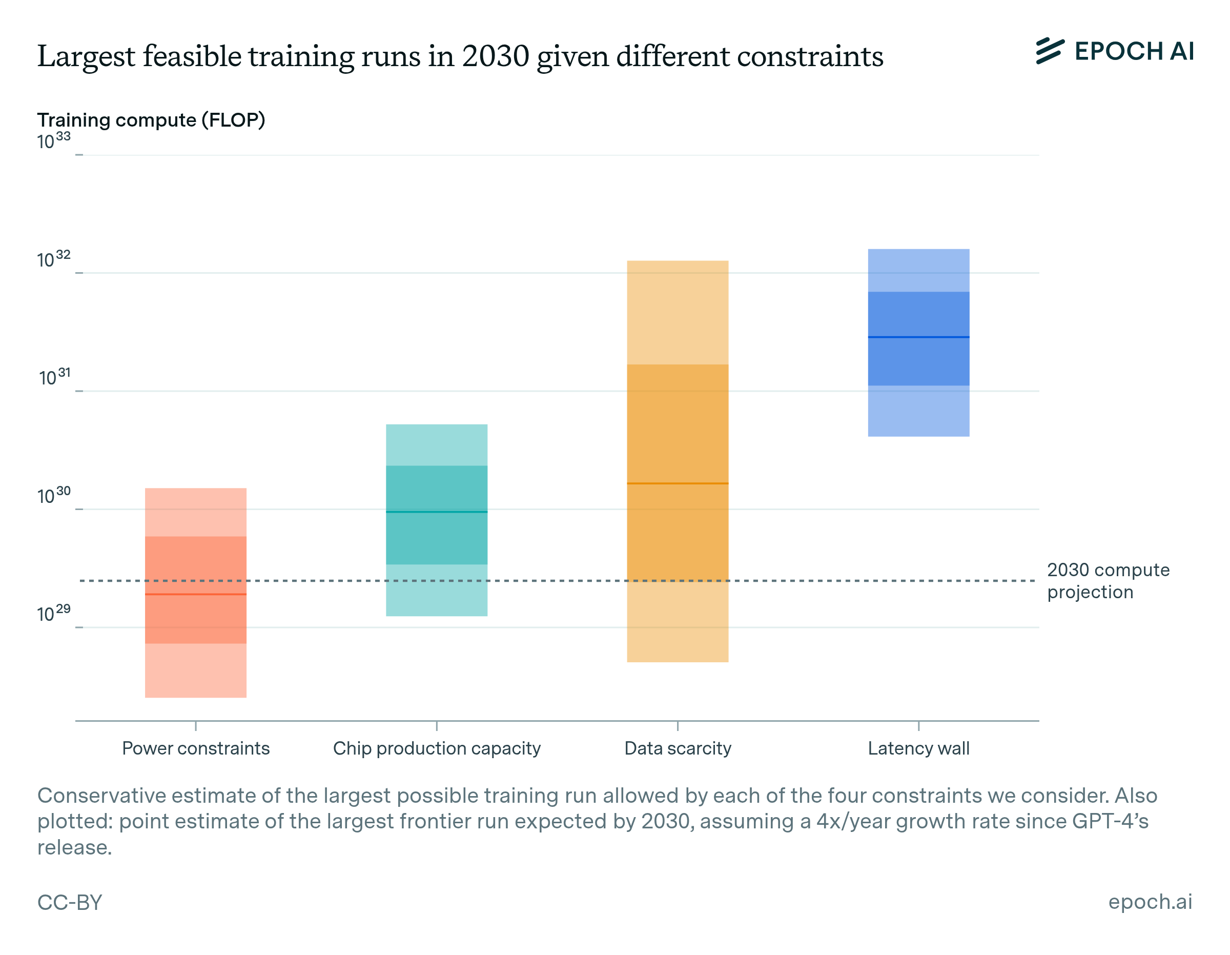 Bottom line. While there is substantial uncertainty about the precise scales of training that are technically feasible, our analysis suggests that training runs of around 2e29 FLOP are likely possible by 2030. This represents a significant increase in scale over current models, similar to the size difference between GPT-2 and GPT-4. The constraint likely to bind first is power, followed by the capacity to manufacture enough chips. Scaling beyond would require vastly expanded energy infrastructure and the construction of new power plants, high-bandwidth networking to connect geographically distributed data centers, and a significant expansion in chip production capacity.