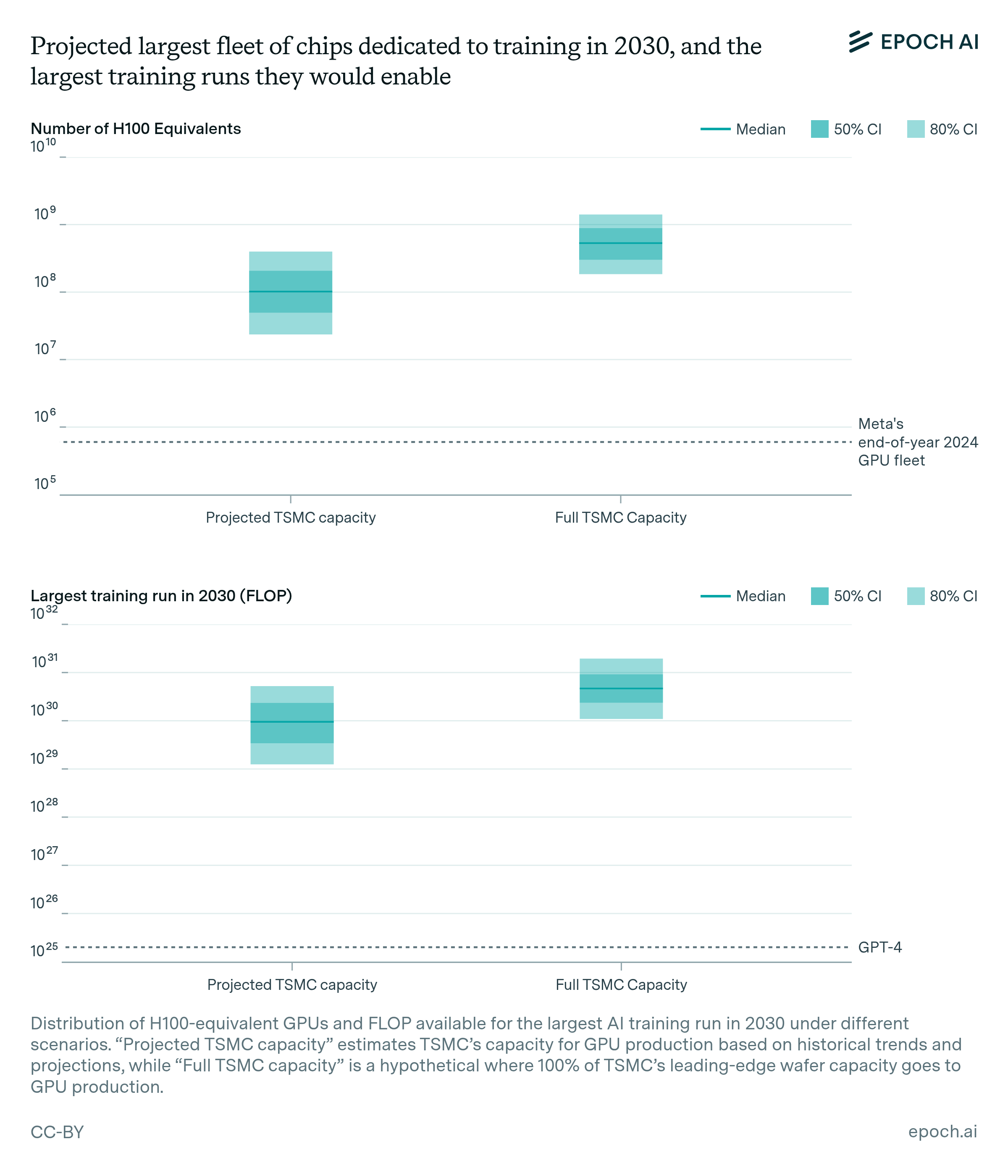 Putting all this together leads us to the following picture. On the median trajectory, about 100M H100-equivalents could, in principle, be dedicated to training to power an 9e29 FLOP training run. However, this projection carries significant uncertainty, with our estimates ranging from 20 million to 400 million H100-equivalents, corresponding to 1e29 to 5e30 FLOP. To establish an upper bound, we considered a hypothetical scenario where TSMC’s entire capacity for 5nm and below is devoted to GPU production, from now until 2030. In this case, the potential compute could increase by an order of magnitude, reaching 1e30 to 2e31 FLOP. This upper limit, based on current wafer production projections, illustrates the maximum possible impact on AI training capabilities if existing constraints in packaging, HBM production, and wafer allocation were fully resolved. Figure 4 below illustrates these estimates, and lists the assumptions behind them.
