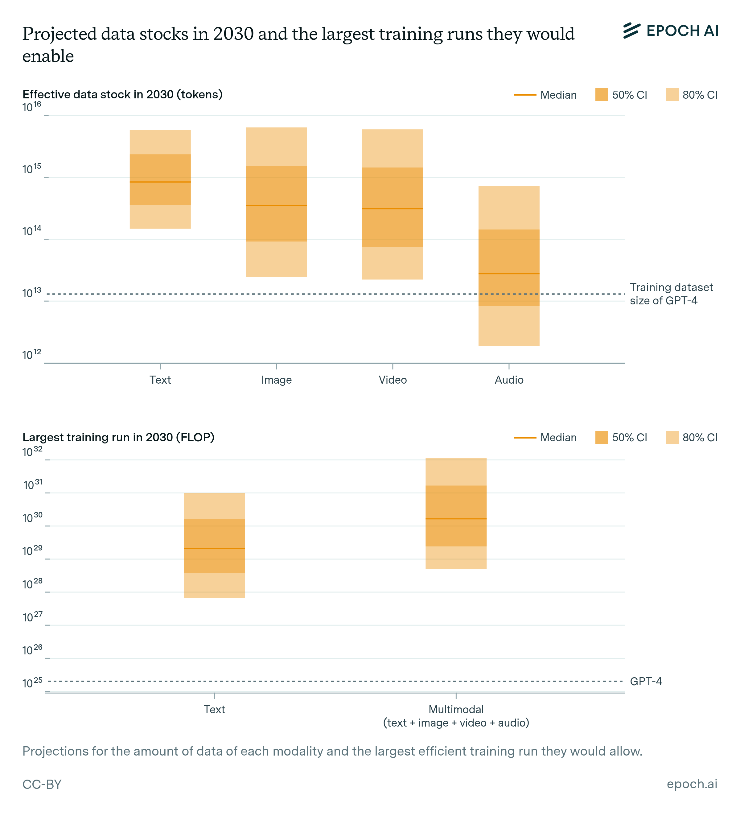 Data scarcity. Training large AI models requires correspondingly large datasets. The indexed web contains about 500T words of unique text, and is projected to increase by 50% by 2030. Multimodal learning from image, video and audio data will likely moderately contribute to scaling, plausibly tripling the data available for training. After accounting for uncertainties on data quality, availability, multiple epochs, and multimodal tokenizer efficiency, we estimate the equivalent of 400 trillion to 20 quadrillion tokens available for training by 2030, allowing for 6e28 to 2e32 FLOP training runs. We speculate that synthetic data generation from AI models could increase this substantially.