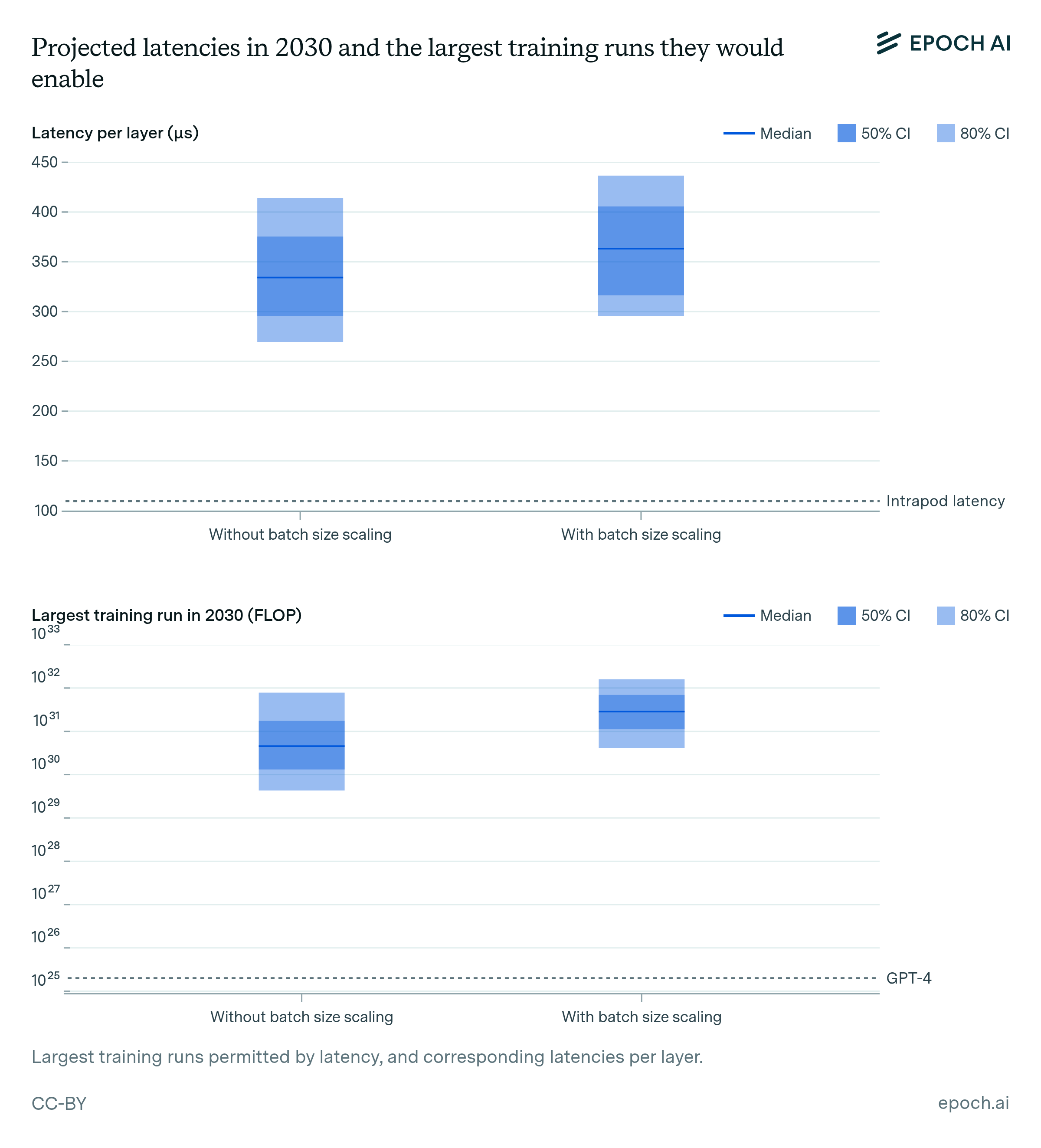 We are uncertain how large batches can be without compromising training effectiveness. We will assume it to be 60 million tokens—which is speculated to match the largest batch size achieved by GPT-4 during training. This would allow for ~1e16 tokens (240M batches x 60M tokens/batch) to be seen during training, which under Chinchilla-optimal scaling would allow for a ~6e31 FLOP training run.38 In other words, latency is not likely to be the binding constraint, even when pessimistically assuming a data center network involving very distant data centers.
