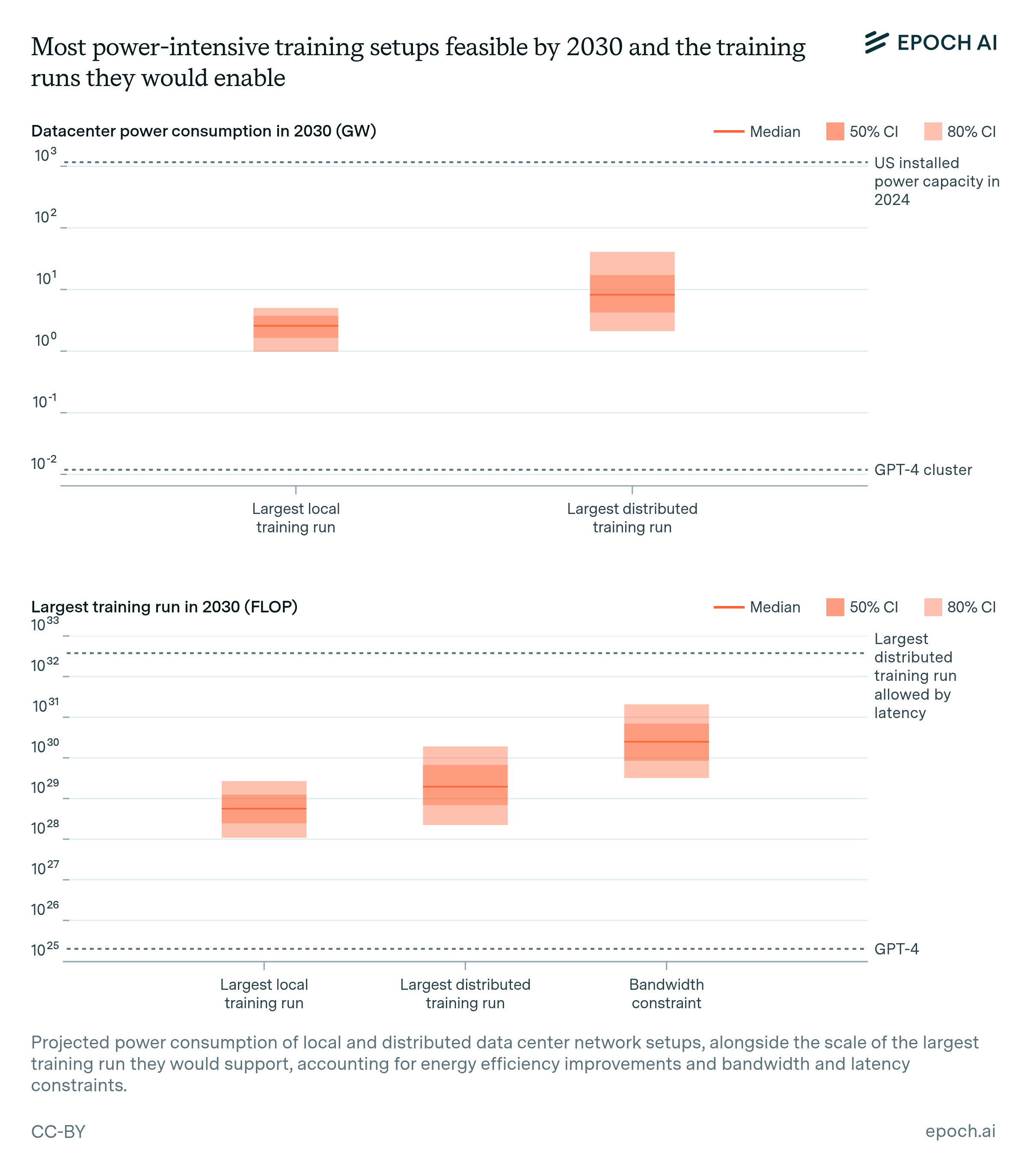 Power constraints. Plans for data center campuses of 1 to 5 GW by 2030 have already been discussed, which would support training runs ranging from 1e28 to 3e29 FLOP (for reference, GPT-4 was likely around 2e25 FLOP). Geographically distributed training could tap into multiple regions’ energy infrastructure to scale further. Given current projections of US data center expansion, a US distributed network could likely accommodate 2 to 45 GW, which assuming sufficient inter-data center bandwidth would support training runs from 2e28 to 2e30 FLOP. Beyond this, an actor willing to pay the costs of new power stations could access significantly more power, if planning 3 to 5 years in advance.