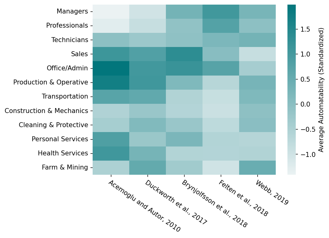 In the AI-focused methodologies, there is relatively little agreement between measures. Brynjolfsson et al. (2018) and Felten et al. (2018) are somewhat similar, showing a broad pattern where the occupations traditionally seen as high-skill are more automatable. However, the individual occupational categories do not agree closely. Webb (2019), conversely, predicts middling automatability across most occupations, with notable exceptions in Sales and Office/Admin (less automatable), and Farm & Mining (more automatable). This intuitively matches the method’s focus on patents before generative AI, typically involving “systematic relationships between inputs and decisions, such as sorting agricultural products” (Webb, 2019).