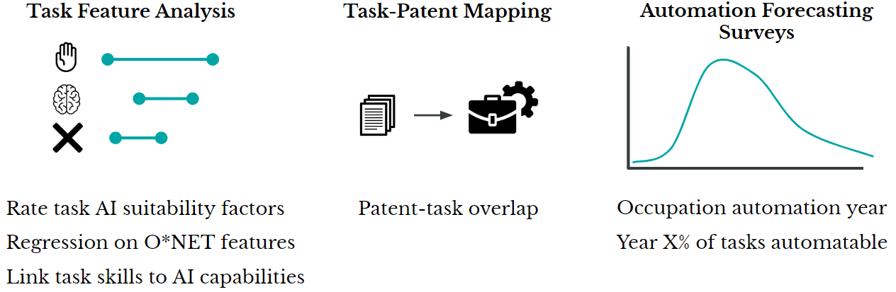 - Task feature analysis to measure how susceptible tasks are to automation, typically informed by AI researchers’ opinions on AI capabilities, which are then linked to features of work tasks.
