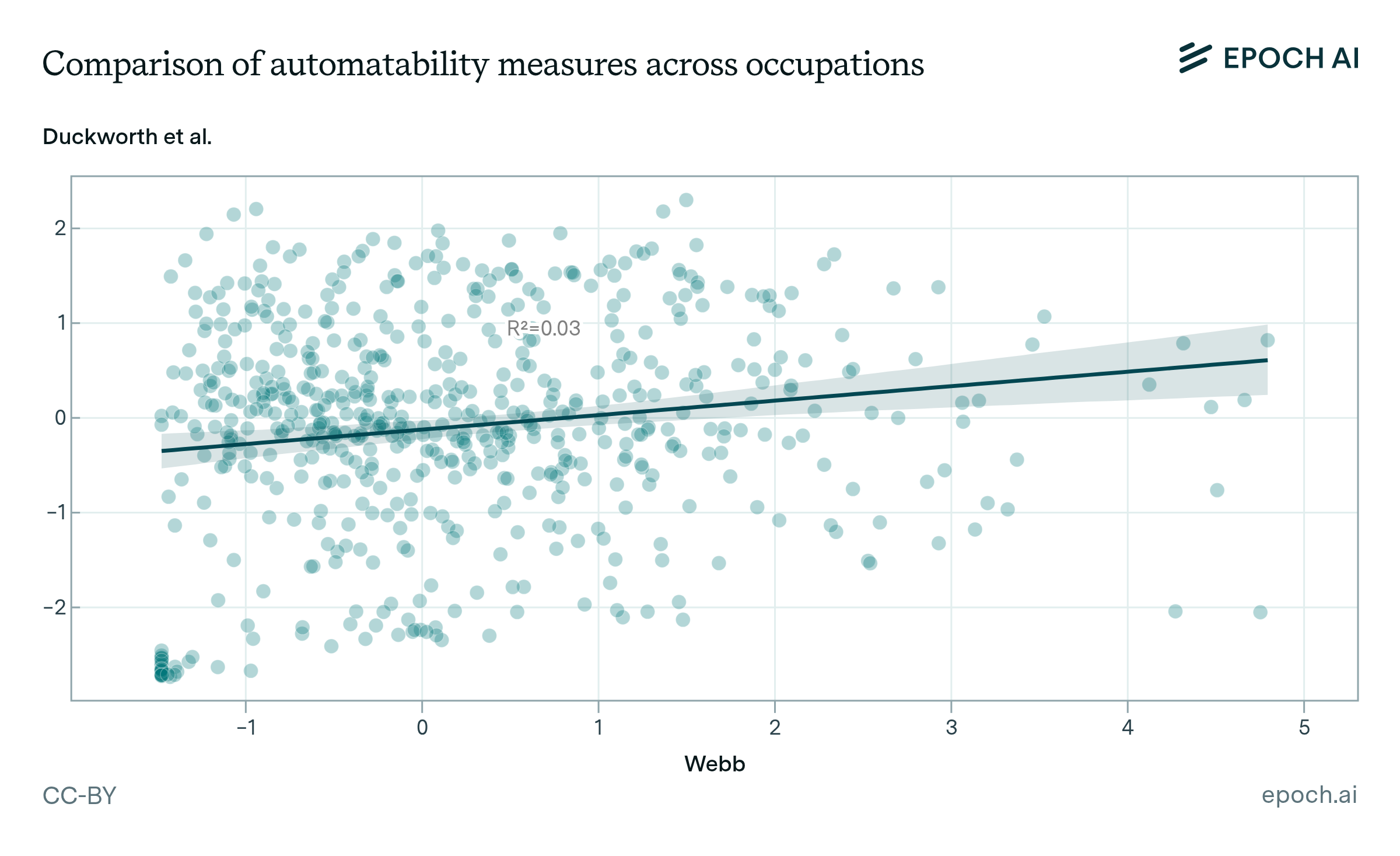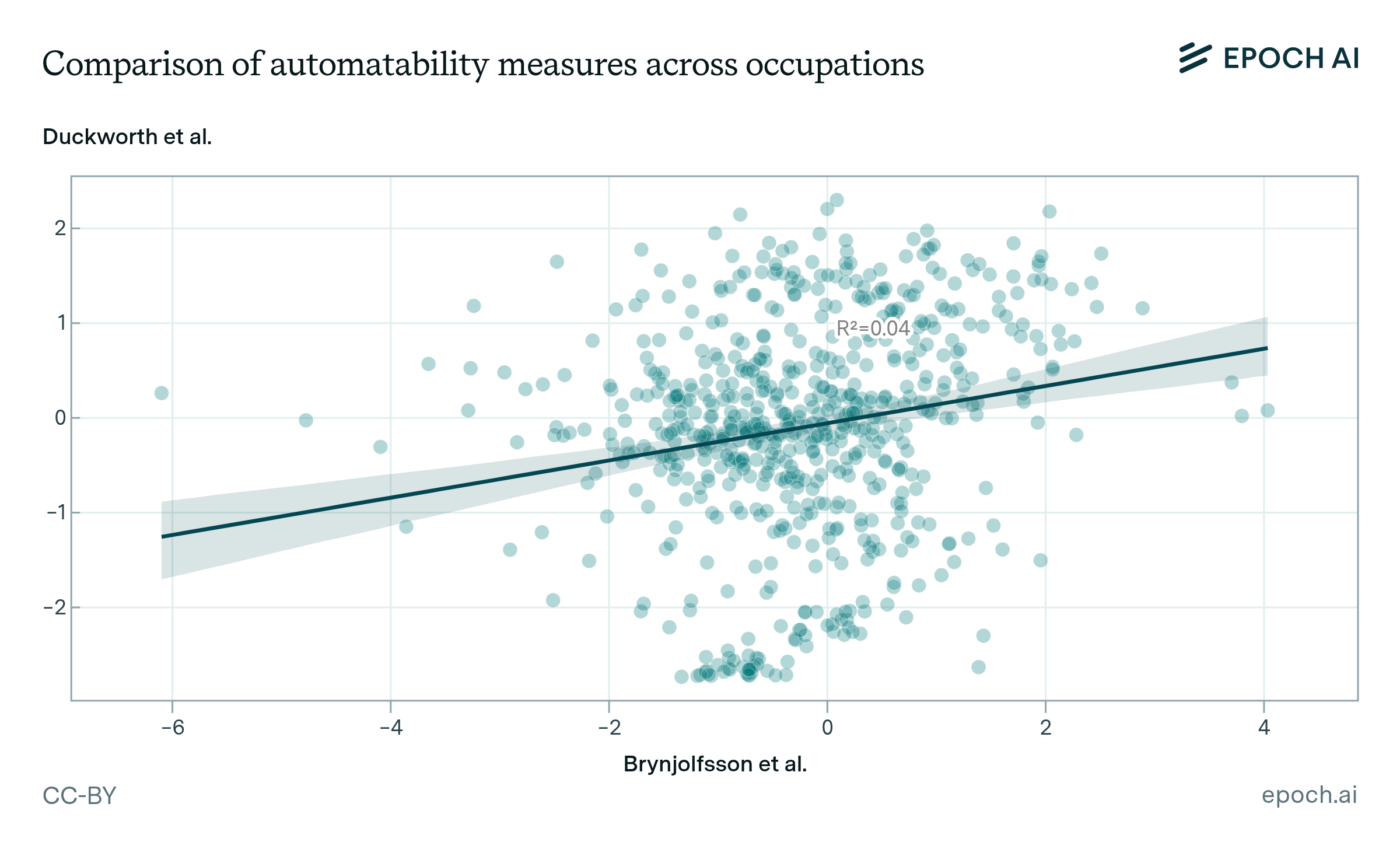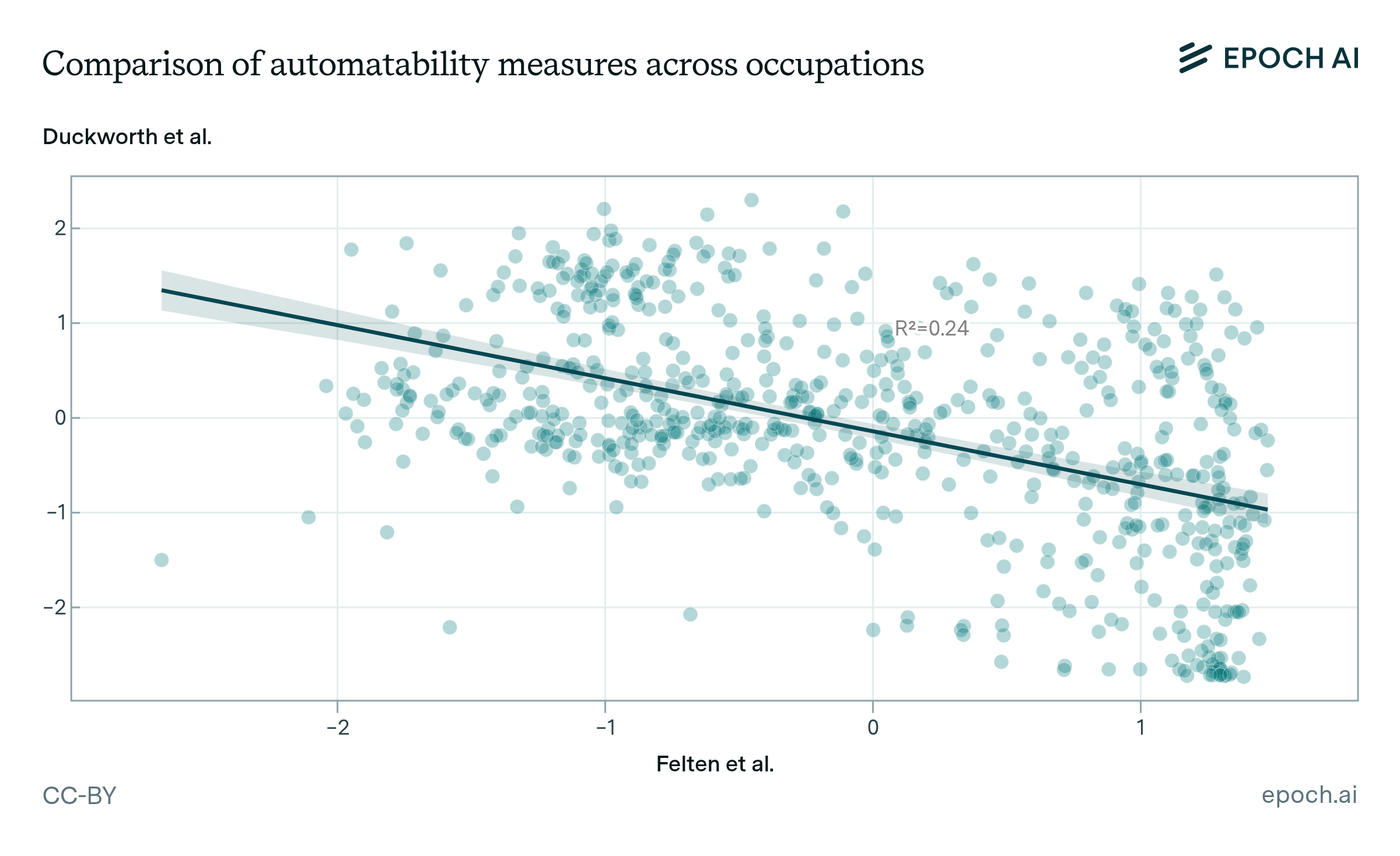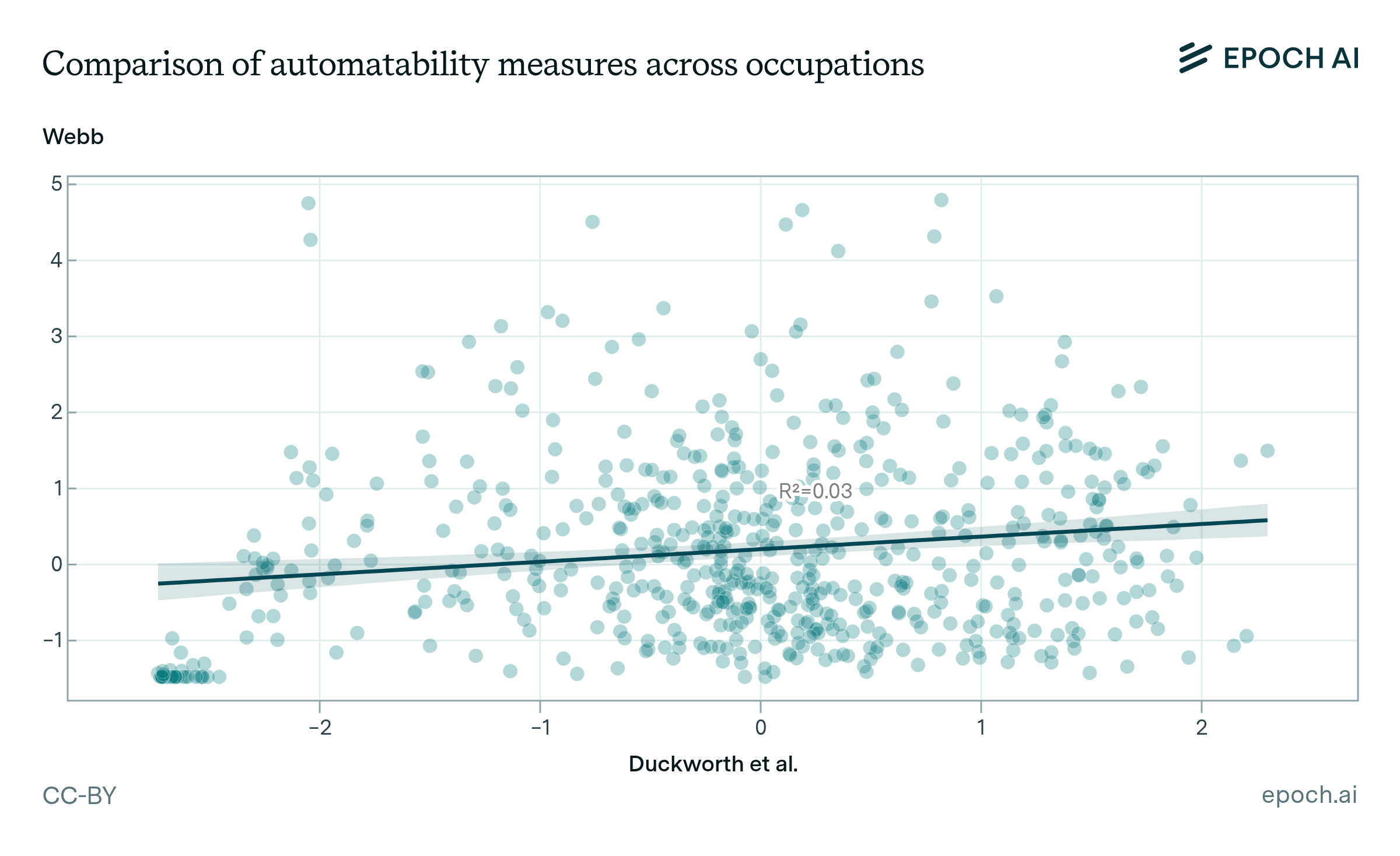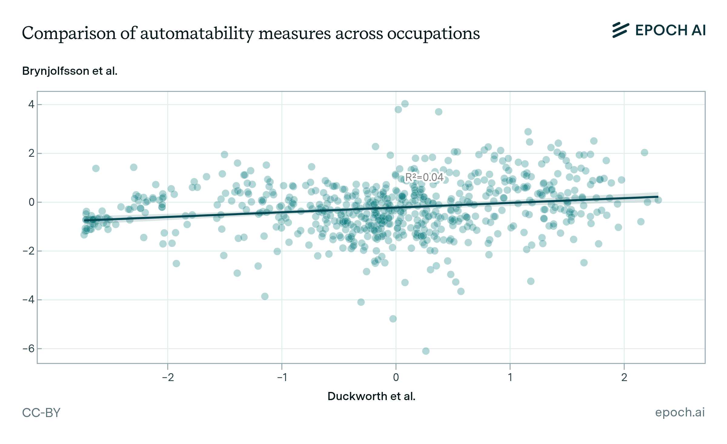 The low agreement between different automatability measures is explored in more detail in Figure 3. Figure 3 shows pairwise comparison of automatability measures, plotting their respective ratings for individual O*NET occupations. Duckworth et al. (2019) shows fairly close agreement with Acemoglu and Autor (2011), further supporting the interpretation that it is dominated by traditional pre-AI ideas of automatability. However, AI-focused measures have little correlation with each other: the strongest agreement is between Felten et al. (2018) and Brynjolfsson et al. (2018), where one measure can explain only 8% of the other’s variance. Other AI measures are wholly uncorrelated. This emphasizes their significantly different predictions, although without validation data it is unclear whether this implies some predictions are more accurate, or that different methods “capture different components of AI exposure” (Acemoglu et al., 2020).
