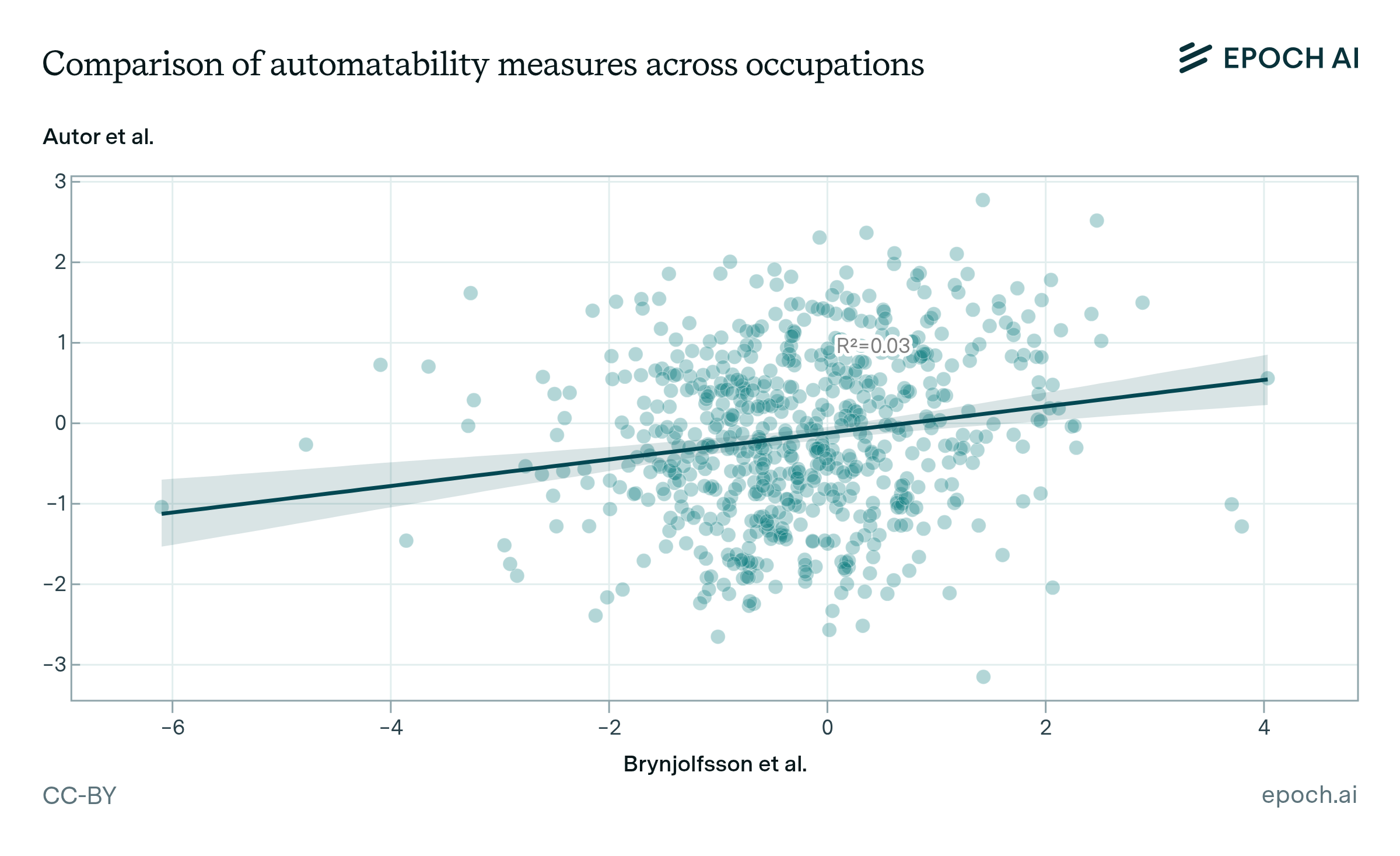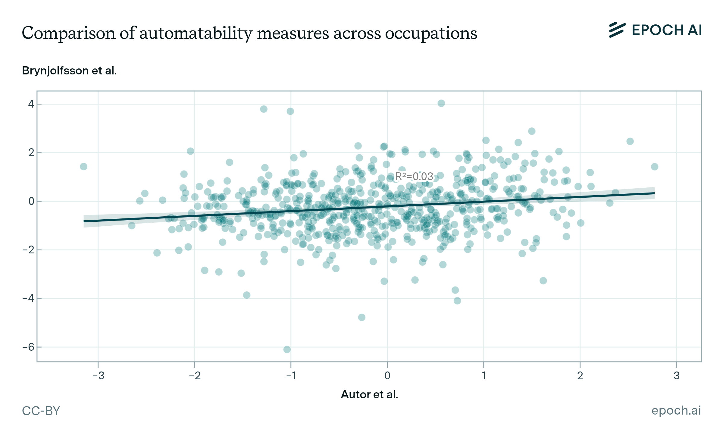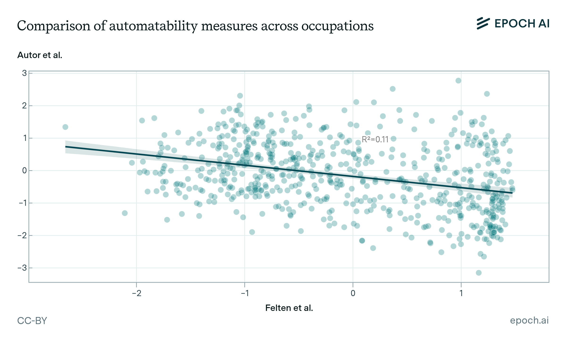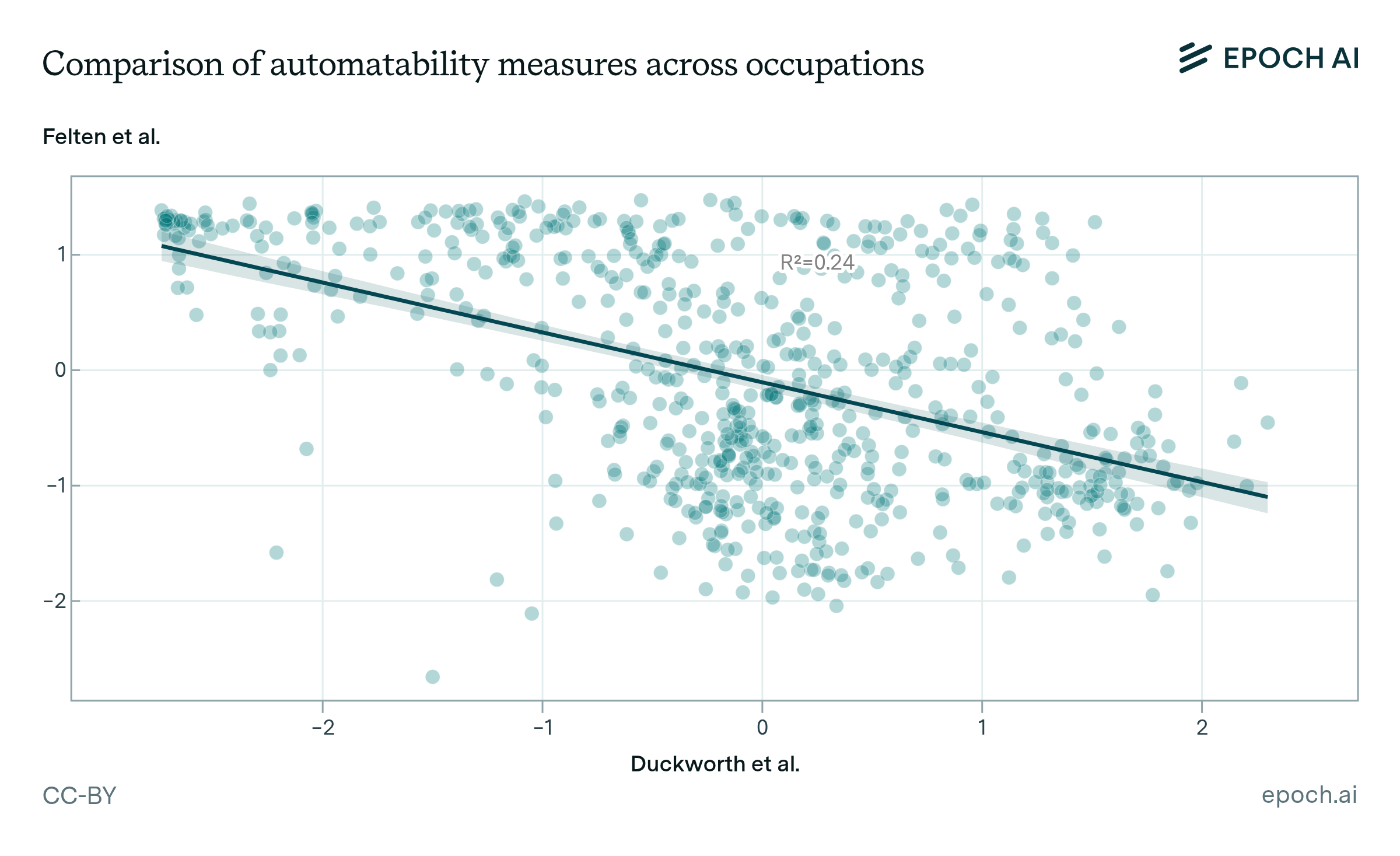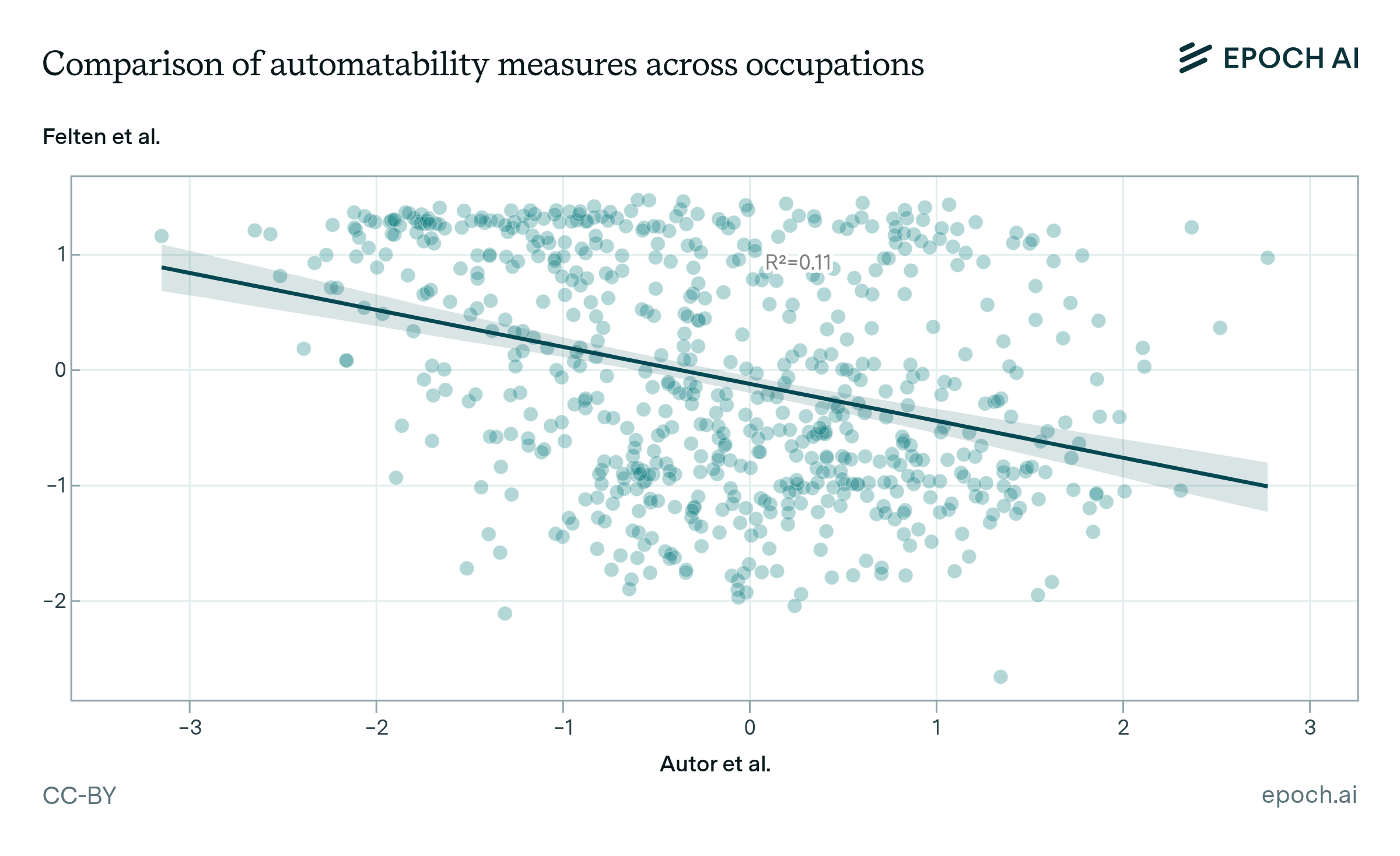The low agreement between different automatability measures is explored in more detail in Figure 3. Figure 3 shows pairwise comparison of automatability measures, plotting their respective ratings for individual O*NET occupations. Duckworth et al. (2019) shows fairly close agreement with Acemoglu and Autor (2011), further supporting the interpretation that it is dominated by traditional pre-AI ideas of automatability. However, AI-focused measures have little correlation with each other: the strongest agreement is between Felten et al. (2018) and Brynjolfsson et al. (2018), where one measure can explain only 8% of the other’s variance. Other AI measures are wholly uncorrelated. This emphasizes their significantly different predictions, although without validation data it is unclear whether this implies some predictions are more accurate, or that different methods “capture different components of AI exposure” (Acemoglu et al., 2020).