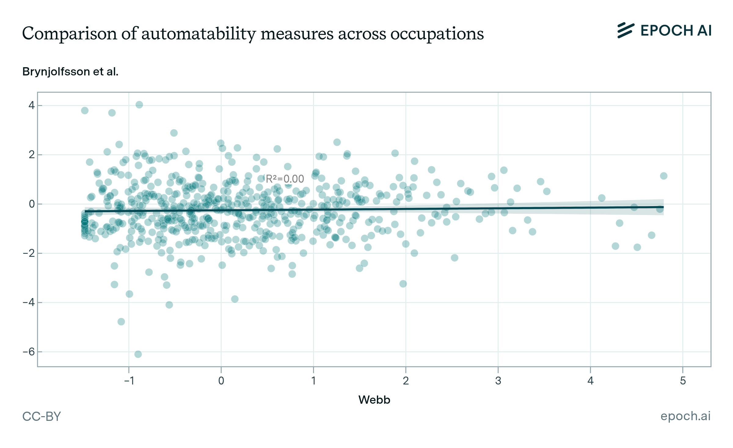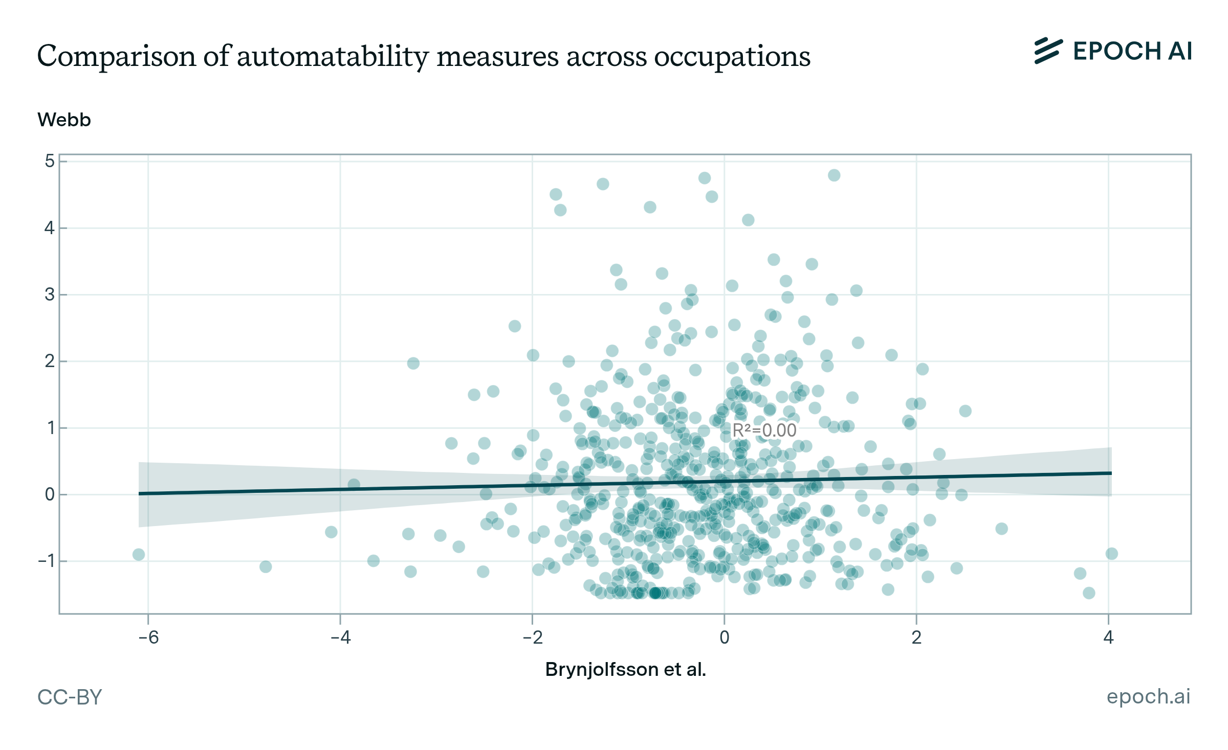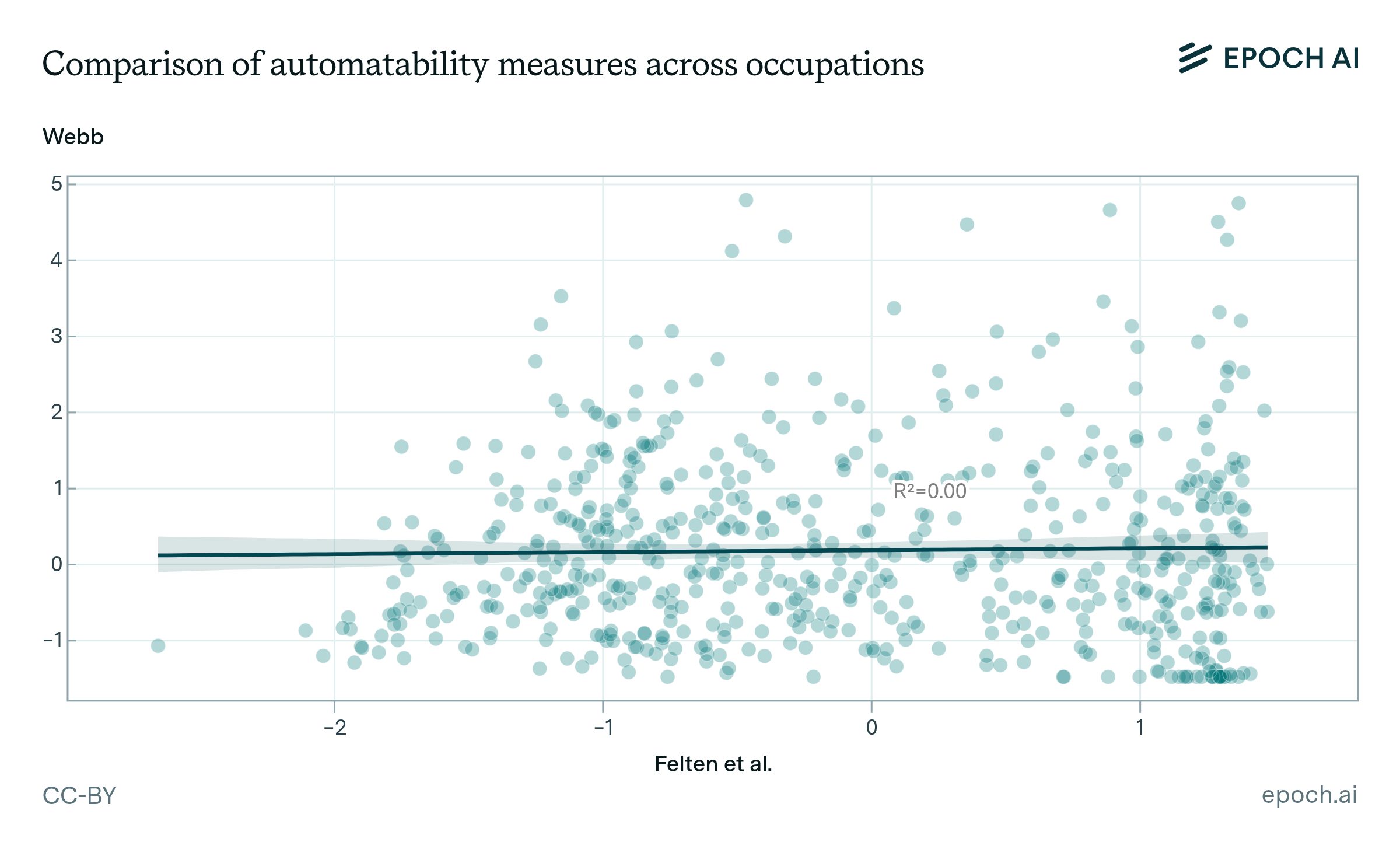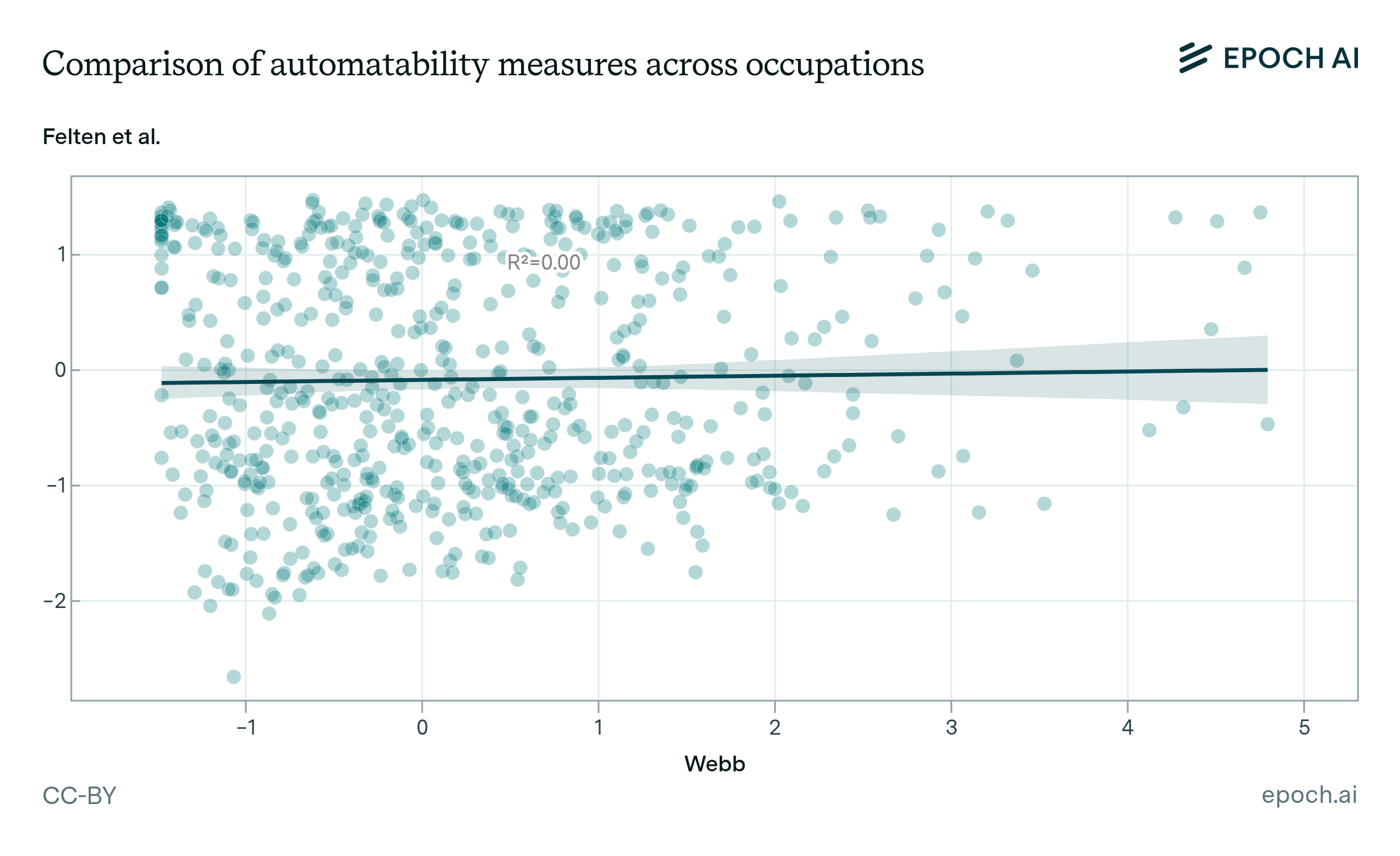An alternative, data-driven approach to measuring automatability is to relate AI patents to occupations whose activities they may automate. This approach was pioneered by Webb (2019), who extracted verb-noun pairs from patents and related them to fine-grained O*NET tasks and occupation descriptions. This allowed him to measure technological exposure to AI – or to older technologies such as industrial robotics and software – depending on the selection of patents. Meindl et al. (2021) did similar work, and expanded the patent selection to cover a broad selection of “Fourth Industrial Revolution” topics. Similarly, Zarifhonarvar (2023) has recently explored a similar text mining approach for measuring occupational exposure to generative language models. Webb (2019)’s data release allowed for a broad comparison against metrics such as Felten et al. (2018) or Brynjolfsson et al. (2018) - discussed further in Empirical evidence and comparison.