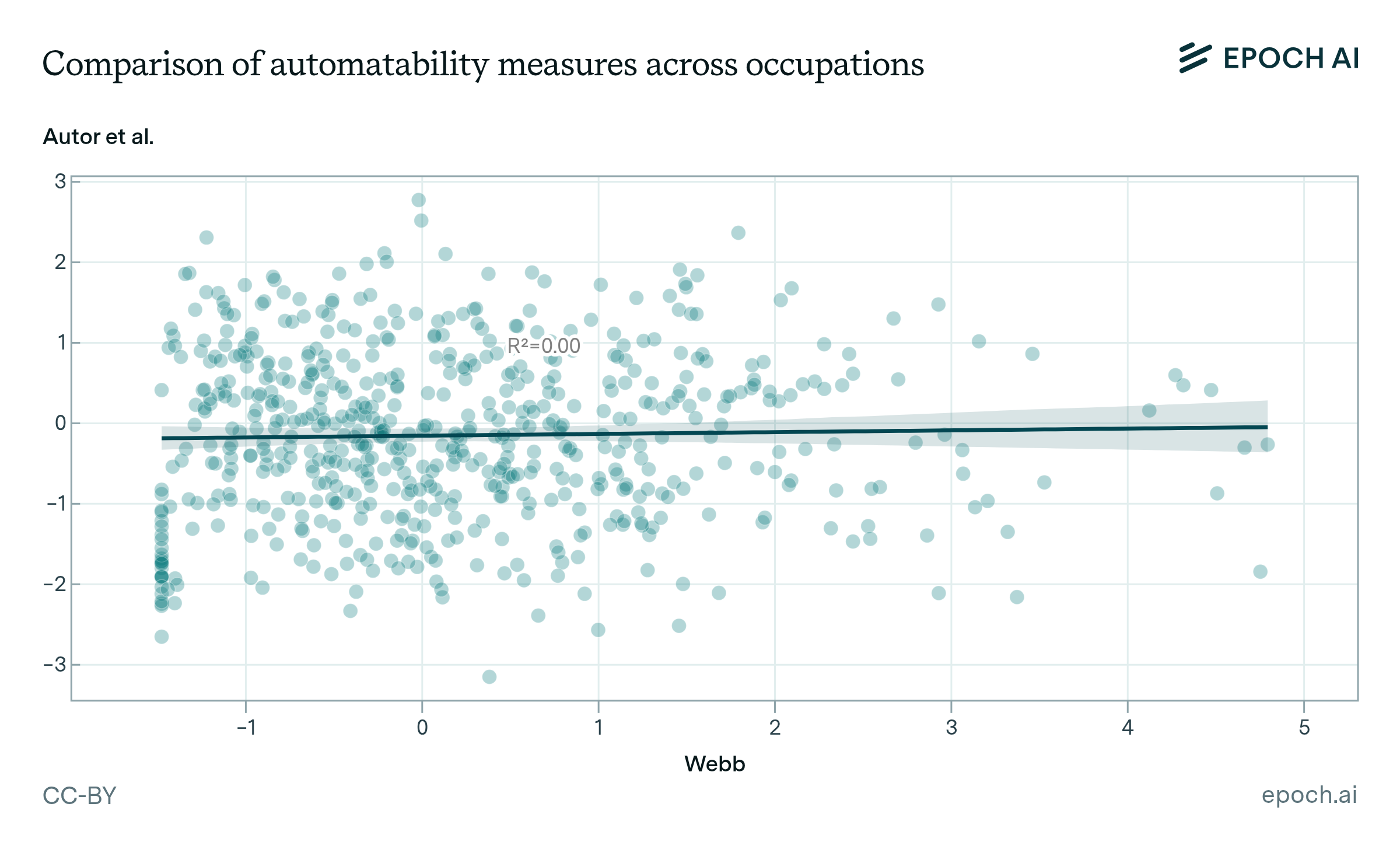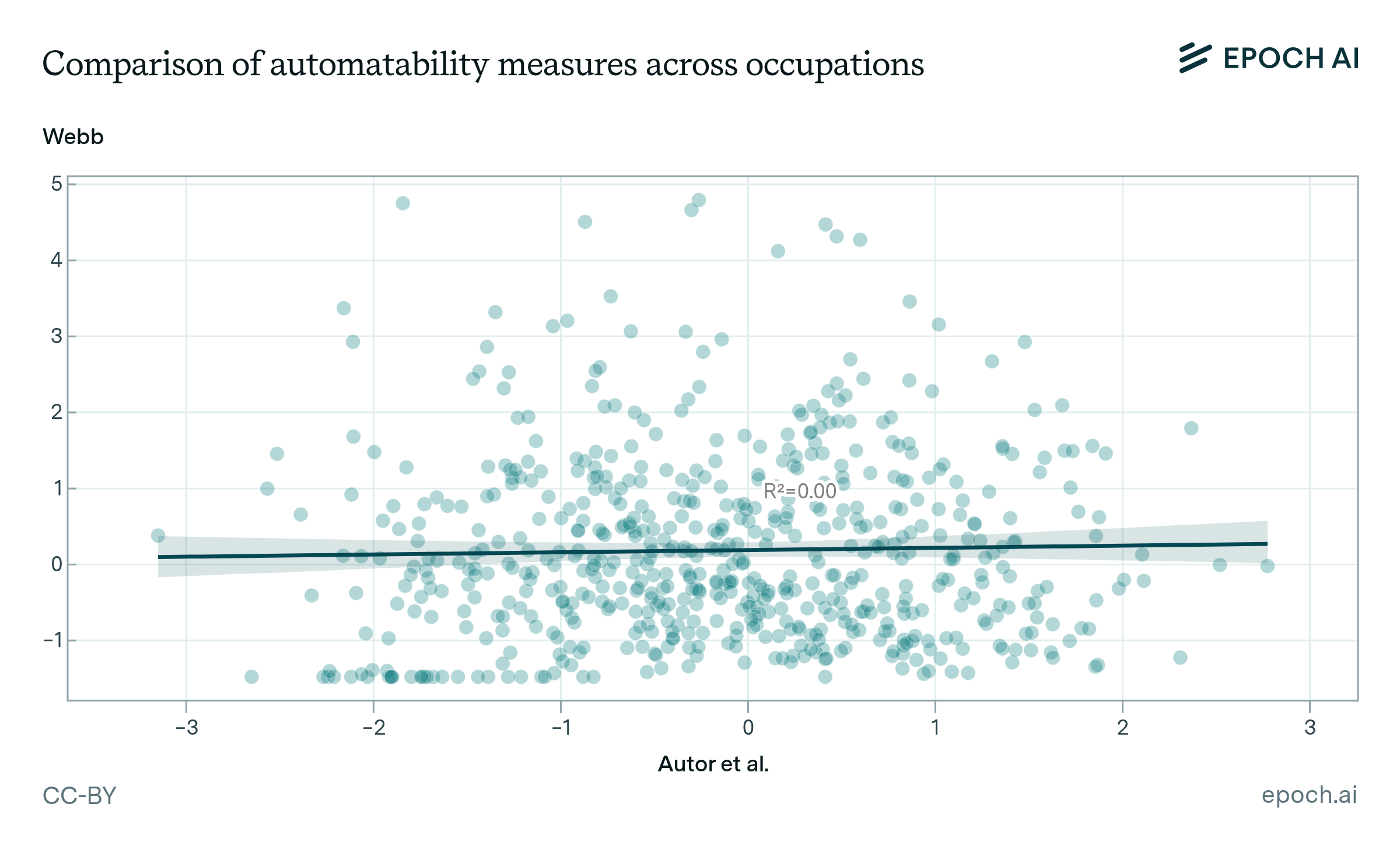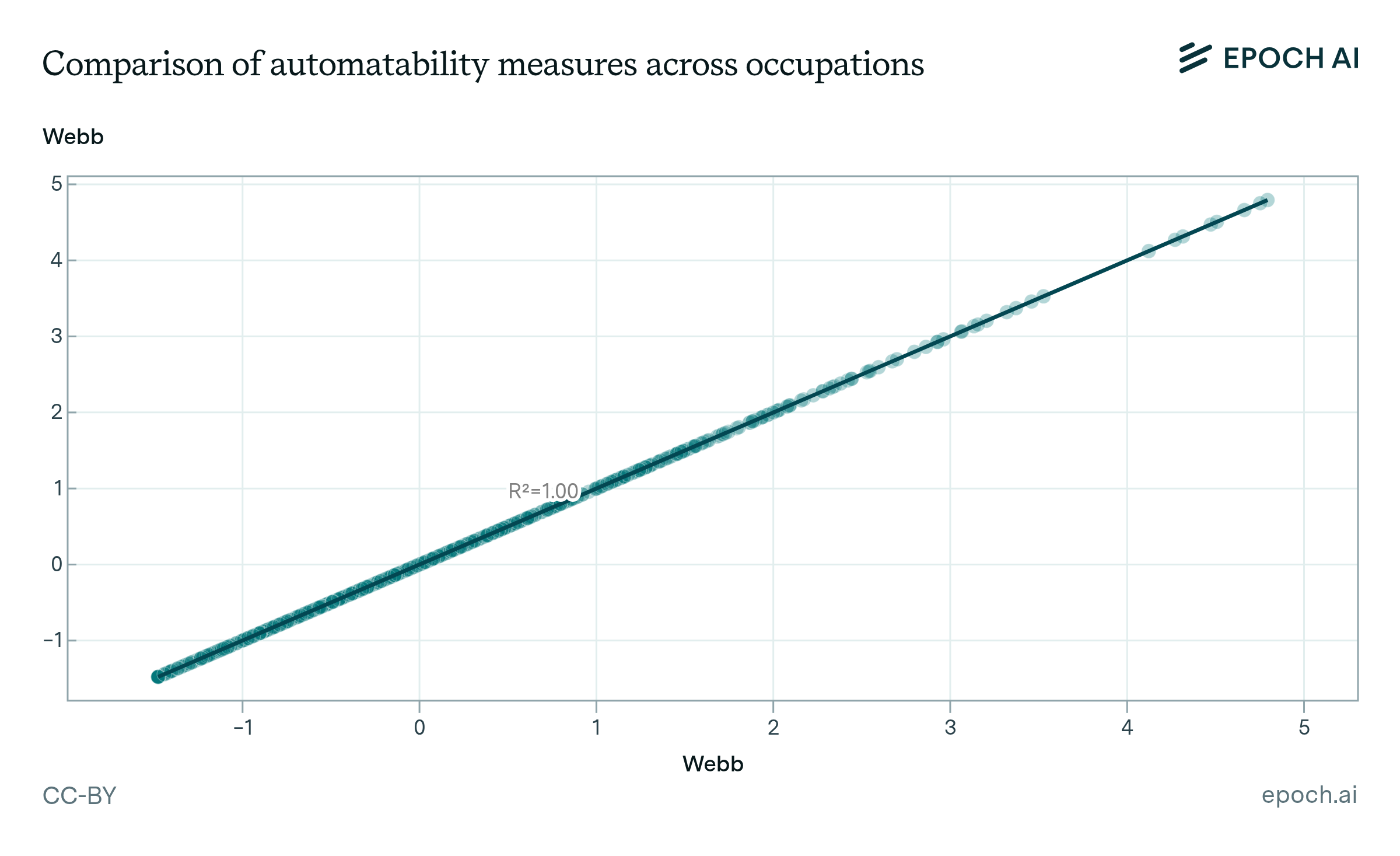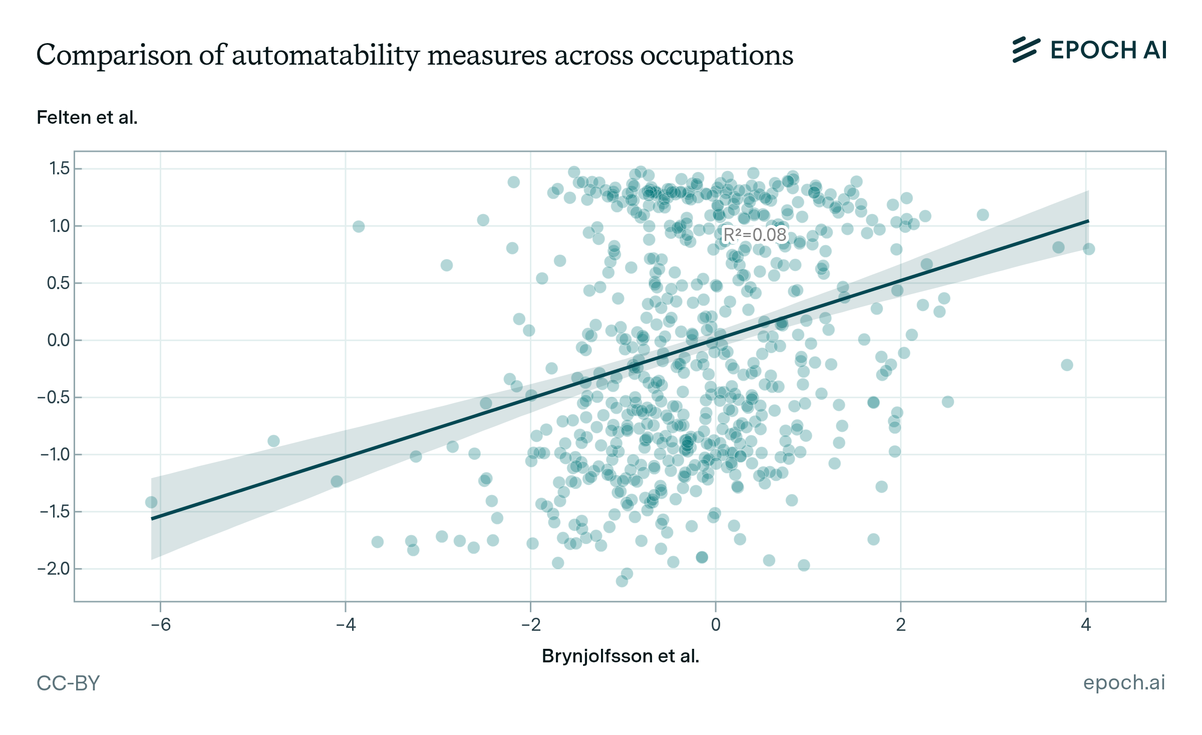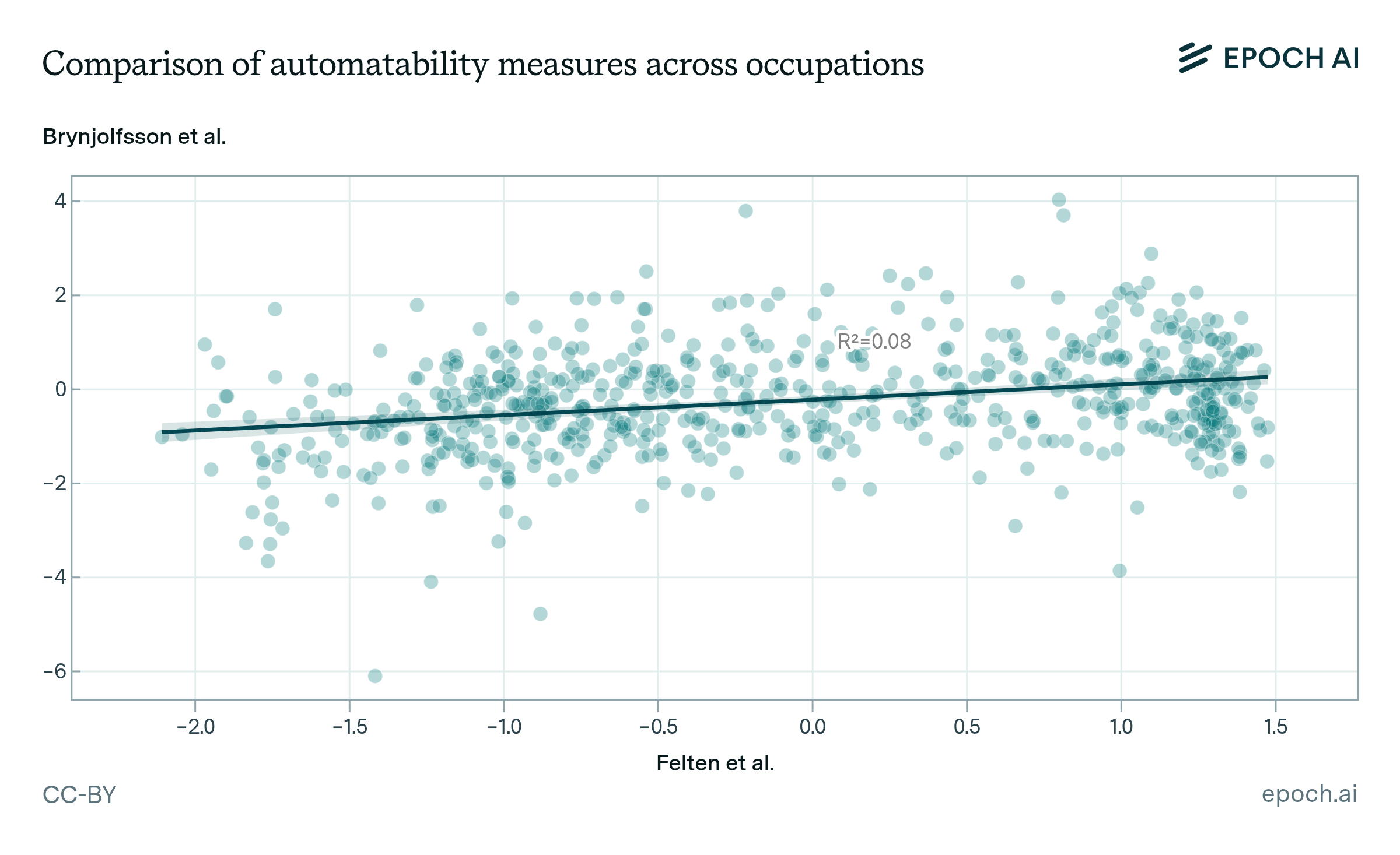 An alternative, data-driven approach to measuring automatability is to relate AI patents to occupations whose activities they may automate. This approach was pioneered by Webb (2019), who extracted verb-noun pairs from patents and related them to fine-grained O*NET tasks and occupation descriptions. This allowed him to measure technological exposure to AI – or to older technologies such as industrial robotics and software – depending on the selection of patents. Meindl et al. (2021) did similar work, and expanded the patent selection to cover a broad selection of “Fourth Industrial Revolution” topics. Similarly, Zarifhonarvar (2023) has recently explored a similar text mining approach for measuring occupational exposure to generative language models. Webb (2019)’s data release allowed for a broad comparison against metrics such as Felten et al. (2018) or Brynjolfsson et al. (2018) - discussed further in Empirical evidence and comparison.