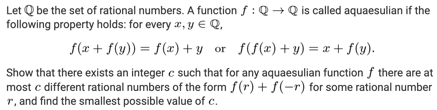 There is some partial progress across these attempts. Coming up with an example that gives c=2 is non-trivial. In some of its other solutions, Deep Think does manage to prove some basic properties about aquaesulian functions f, including that f(0)=0, f is bijective, and -f(-f(x)) = x. Then again, it also attempts to prove several incorrect properties, such as that f(f(x))=x and that f(x+y) = f(x)+f(y).