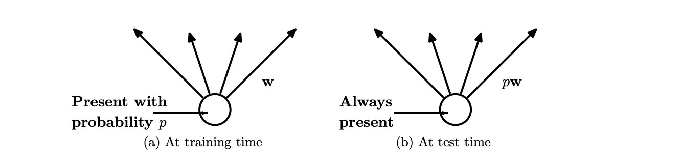 [Image source: Srivastava et al] (a) Shows dropout being implemented during training, where a neuron is dropped out with probability p. This is implemented by multiplying the neuron value by 0 if it is dropped out, and 1 otherwise. (b) Shows the same neuron at test time, where the weights of its outgoing connections are multiplied by p.