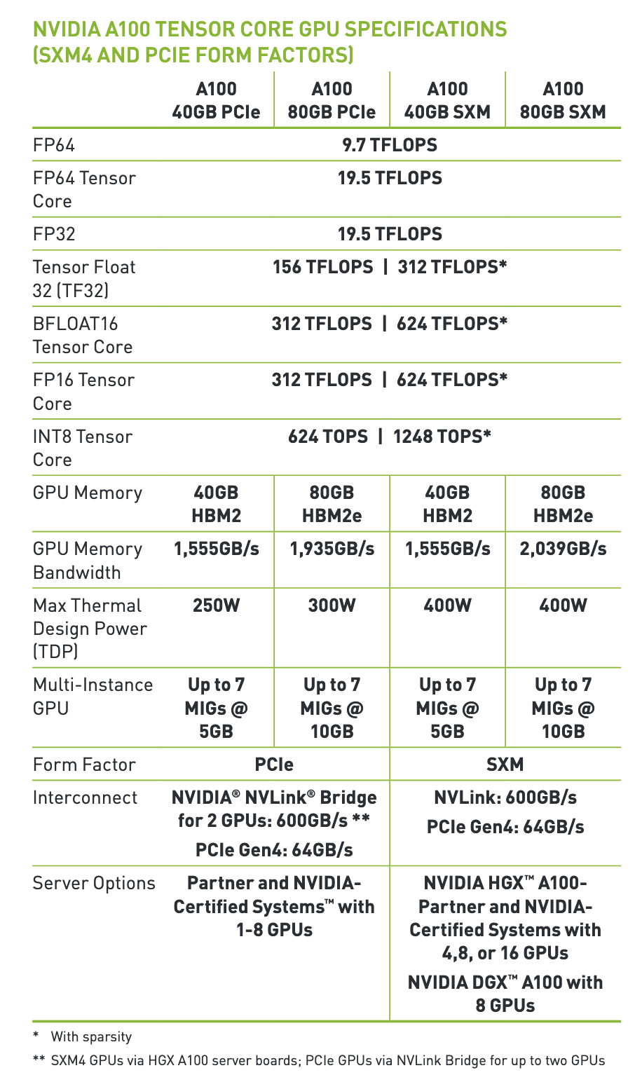 In the datasheet, we find three different versions of the GPU. The NVIDIA NVLink systems interface is usually used in datacenters, and I’d recommend defaulting to this option — assuming the model was authored by a company. However, the selection of which version is not that crucial, as the performance differences are rather minimal (compared to our estimates).