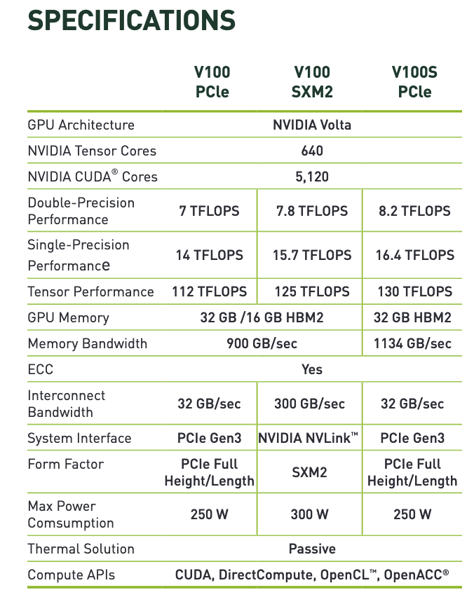 Figure 5: Specification sheet of NVIDIA V100 GPU (Source).