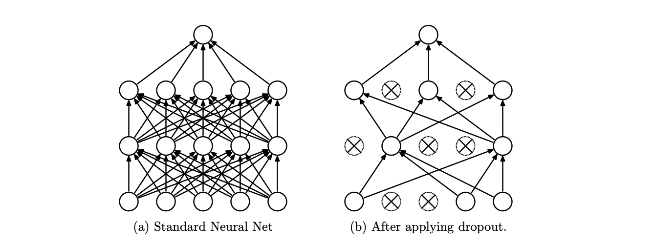 [Image source: Srivastava et al] (a) shows a standard neural network without dropout, (b) shows a thinned network, where crossed units have been “dropped out”.