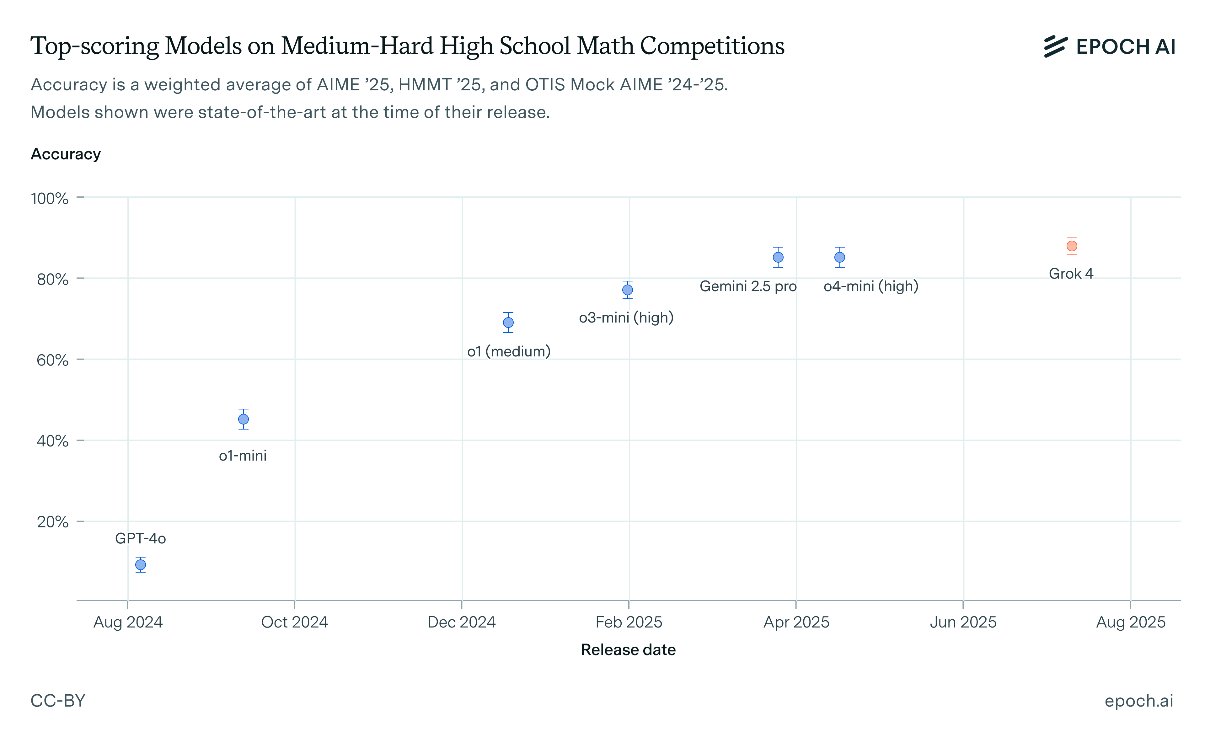 On a rough 1–10 difficulty scale, where 1 is an easy word problem and 10 is the hardest problem ever given on any high school math competition, problems from these competitions fall in the 2–6 range and cluster toward the upper end of that range. I thus refer to them as “medium-hard”. I use data from independent evaluations conducted by MathArena and Epoch.2