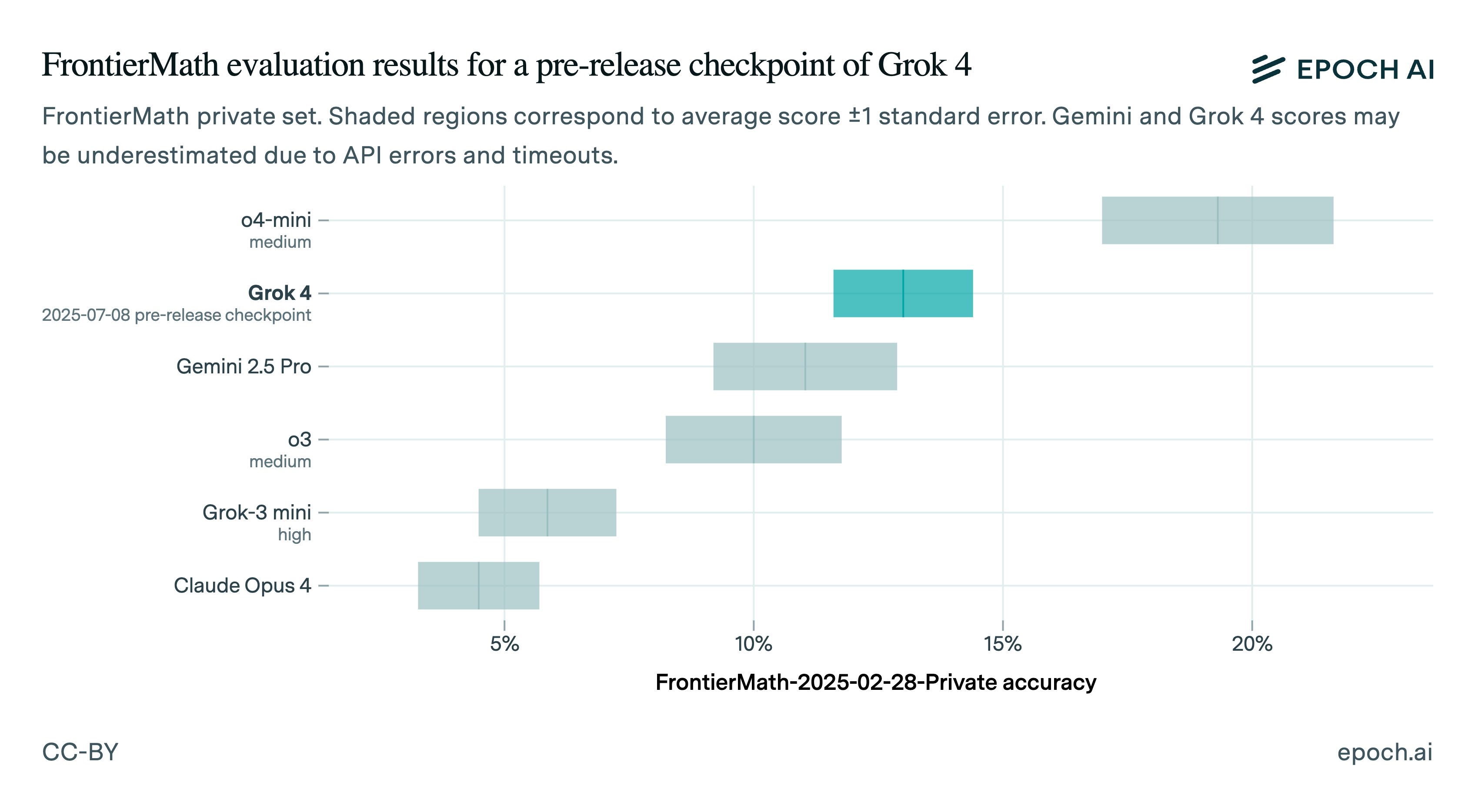 We have thus far run Grok 4 on FrontierMath’s Tier 1-3 problems twice, trying to find API settings that would let us get a complete run. Grok 4 scored 14% and 12% on these runs, which we consider to be statistically indistinguishable. This puts it ahead of all other models that we have run, except for o4-mini.11