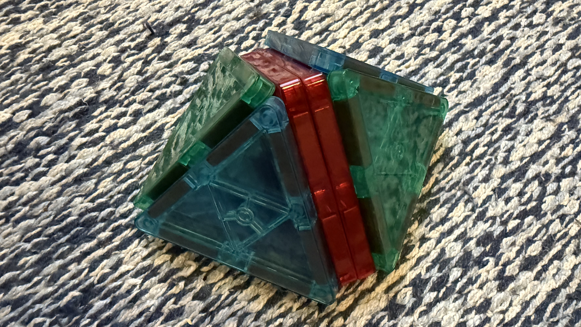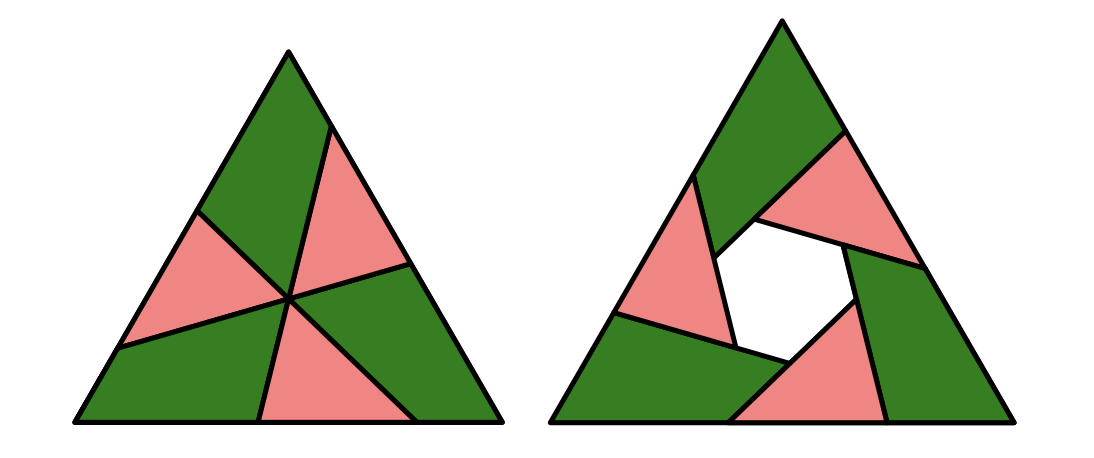 This is counterintuitive because, in general, when you glue two tetrahedra together you get a shape with 6 faces: each tetrahedron has 4, so 8 in total, but you subtract the 2 faces that got glued together, leaving 6. In this case, however, it happens that 2 of those 6 faces line up in the same plane. Namely, two of the 45-45-90 triangles become the square base of the pyramid. The resulting shape, the square-based pyramid, has only 5 faces. Thus, a bit like the flagstones problem, there is a “default” answer that is wrong. For a human, physical perception is the easiest route to realizing this.