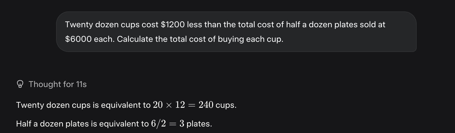 This problem reminds me of the questions on the Cognitive Reflection Test, featured in Thinking, Fast and Slow. The questions on that test are designed to have an answer which is “intuitive, appealing, but wrong”. Of course, LLMs are familiar with the original Cognitive Reflection Test questions, so it’s lucky for us that GSM8K (perhaps unintentionally) has a less-well-known question of the same style. It lets us see if LLMs fall for trick questions of this form, or if they’re able to notice when there’s more than meets the eye.