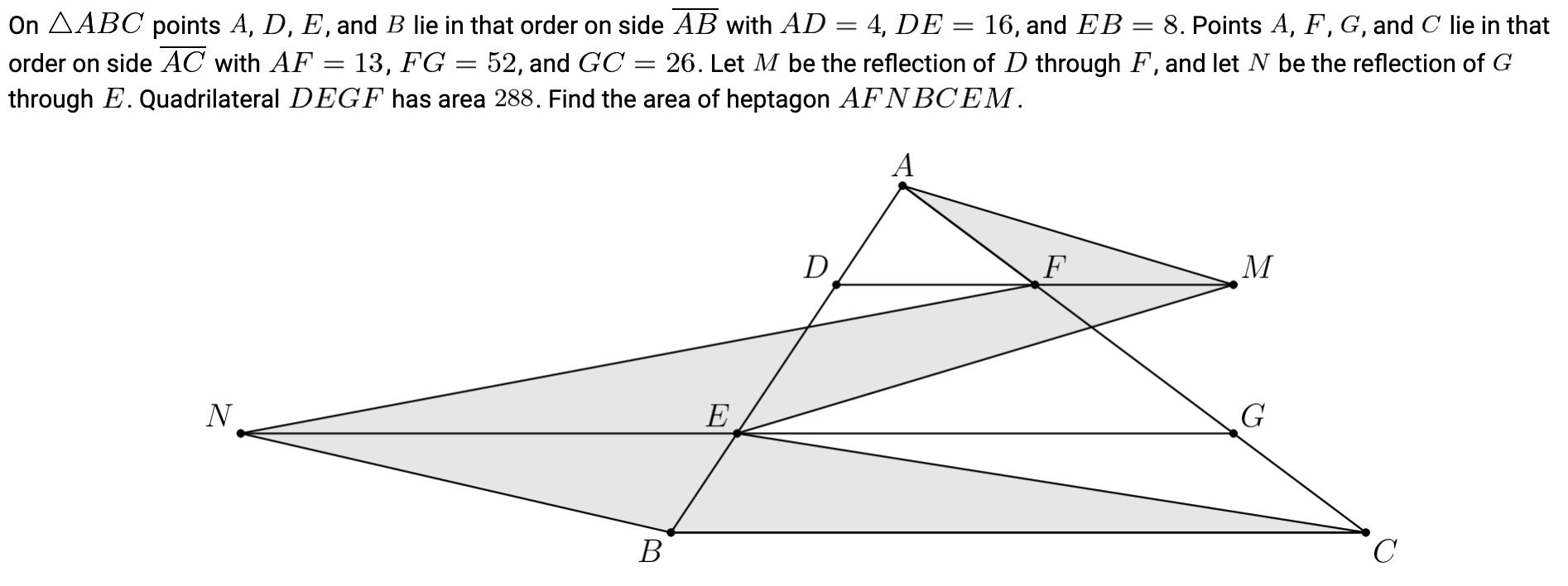 This problem takes a moment to understand, but it has a simple solution: the bottom chunk of the grey region is equal in area to the bottom chunk of the triangle. So too for the middle and top chunks. Thus, you can ignore the heptagon and just find the area of the triangle, which is easy to do using basic geometry theorems.