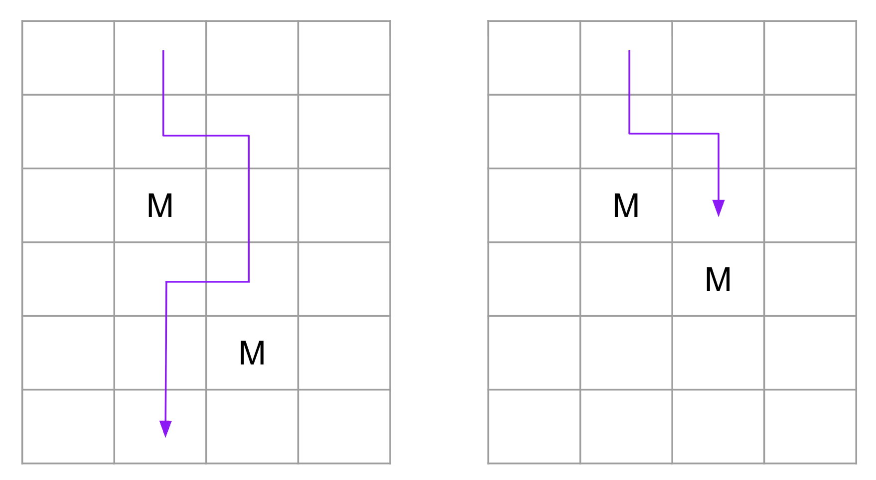 2023 is sufficient: go straight down each column, and eventually you’ll find the safe one—though it might be the last one you try, if you get unlucky. Can you do better? With this sort of problem, either there’s a clever way to do better, or a clever way to prove that it’s impossible to do better. Playing around, there are some promising patterns. For instance, if you ever find two monsters in adjacent columns that are not in diagonally adjacent cells, then you can zigzag around them, as shown on the left below. But if the monsters are in diagonally adjacent cells, this doesn’t work, as shown on the right. In fact, the monsters could be in one big diagonal running across the whole grid, so the pattern on the left never appears. Of course, maybe there’s a strategy that would take advantage of this…