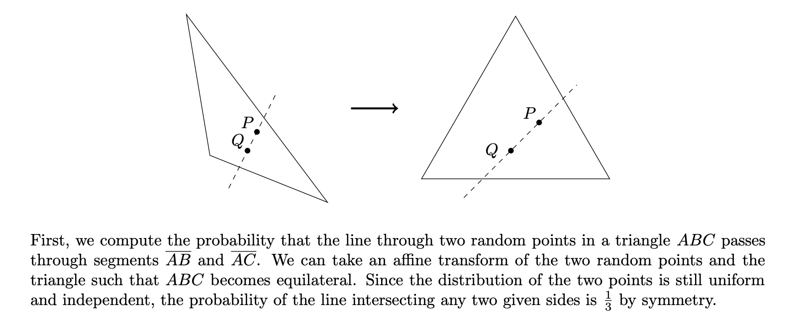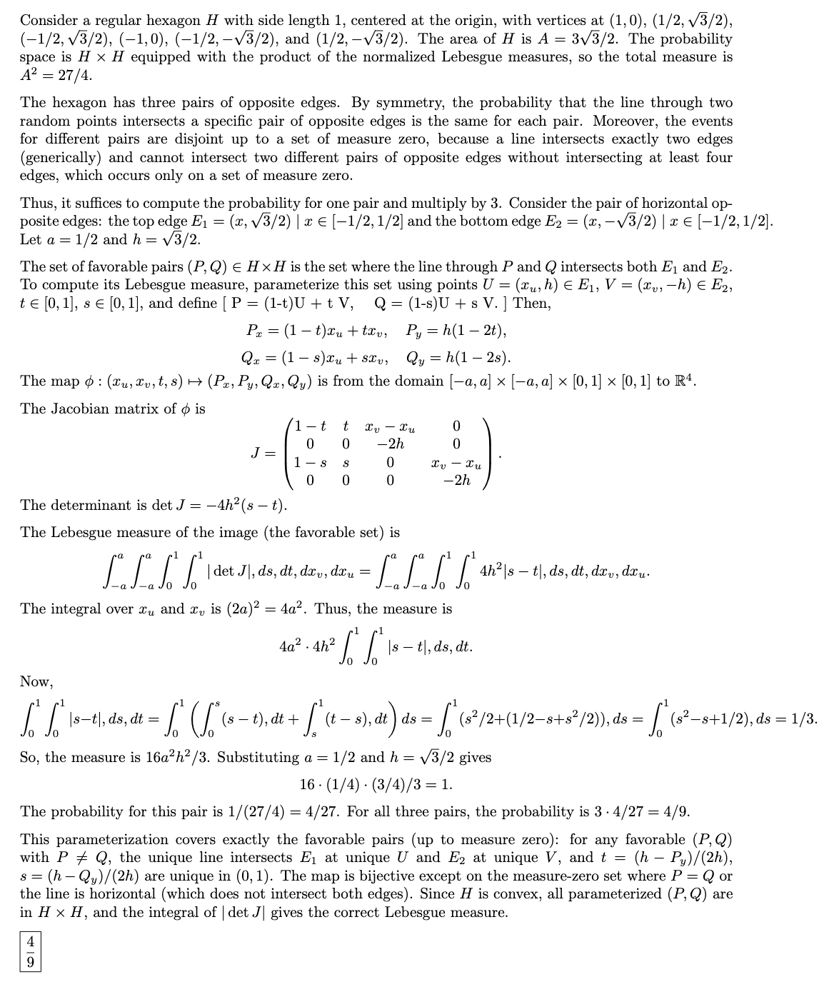 Grok 4 solves this problem differently. Here is a representative sample, though I suggest you skim it. The upshot is that Grok 4 places the hexagon in the Cartesian plane, considers the space of lines parametrized in four-dimensional space (two coordinates for each line), and uses a quadruple-integral to find the (hyper)volume representing the final answer.
