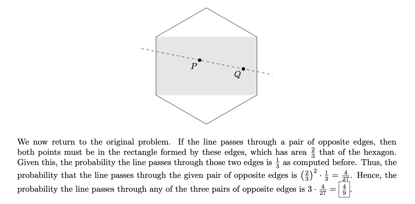 Two points are selected independently and uniformly at random inside a regular hexagon. Compute the probability that a line passing through both of the points intersects a pair of opposite edges of the hexagon.