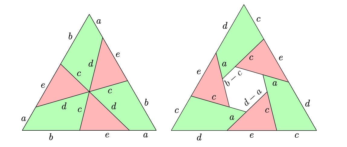 The human reference solution isn’t that conceptual. It labels the diagram as shown below, and then uses standard geometry facts to deduce five relationships among a, b, c, d, and e. Then it’s just a matter of solving the resulting system of equations.