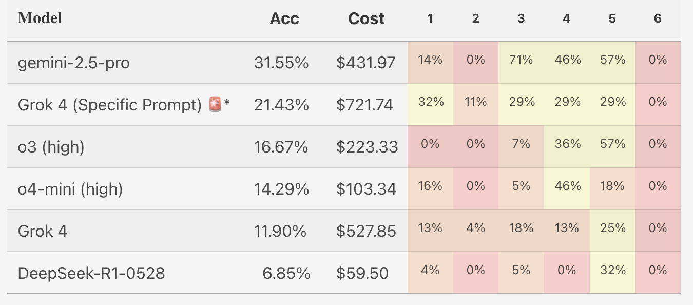 The table below shows results for both Grok 4 runs, plus initial results for other models.