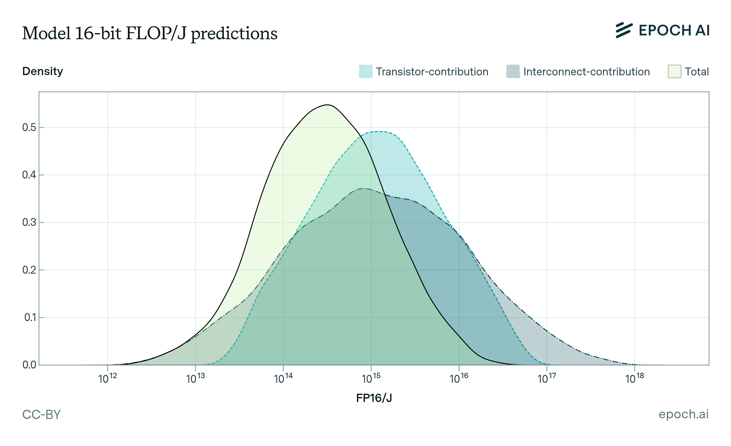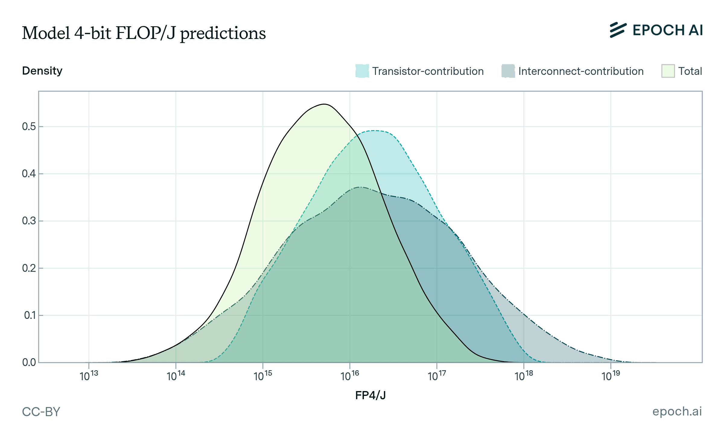 Given these ranges, we determine a distribution over the predicted FLOP/J using Monte Carlo simulation. This has a geometric mean of around \(5 \times 10^{15}\) FLOP/J at 4-bit precision, with a log-space standard deviation of 0.7 orders of magnitude. If we assume that the energy cost scales quadratically with the number precision, we end up with a geometric mean of \(2.9 \times 10^{14}\) FLOP/J at 16-bit precision.