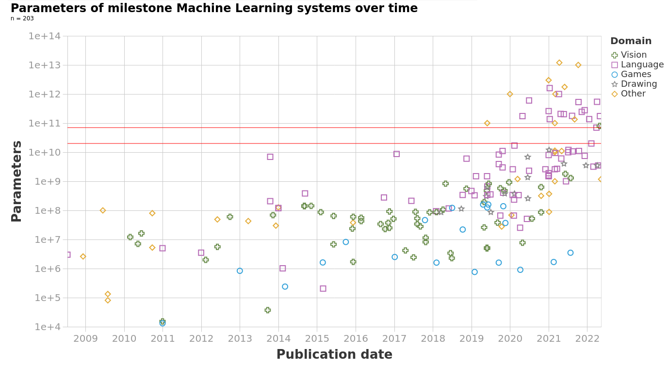 Figure 2: Model size over time, separated by domain. Red lines highlight the parameter gap. Most systems above the gap are language or multimodal models.