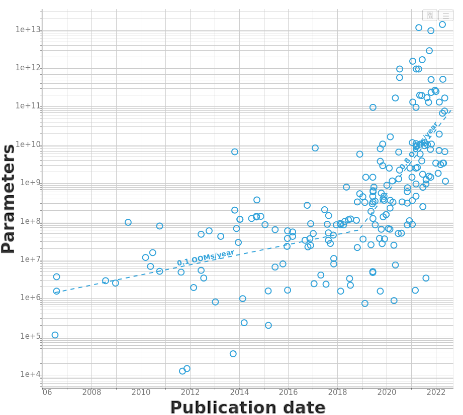 Summary: The model size of notable machine learning systems has grown ten times faster than before since 2018. After 2020 growth has not been entirely continuous: there was a jump of one order of magnitude which persists until today. This is relevant for forecasting model size and thus AI capabilities.