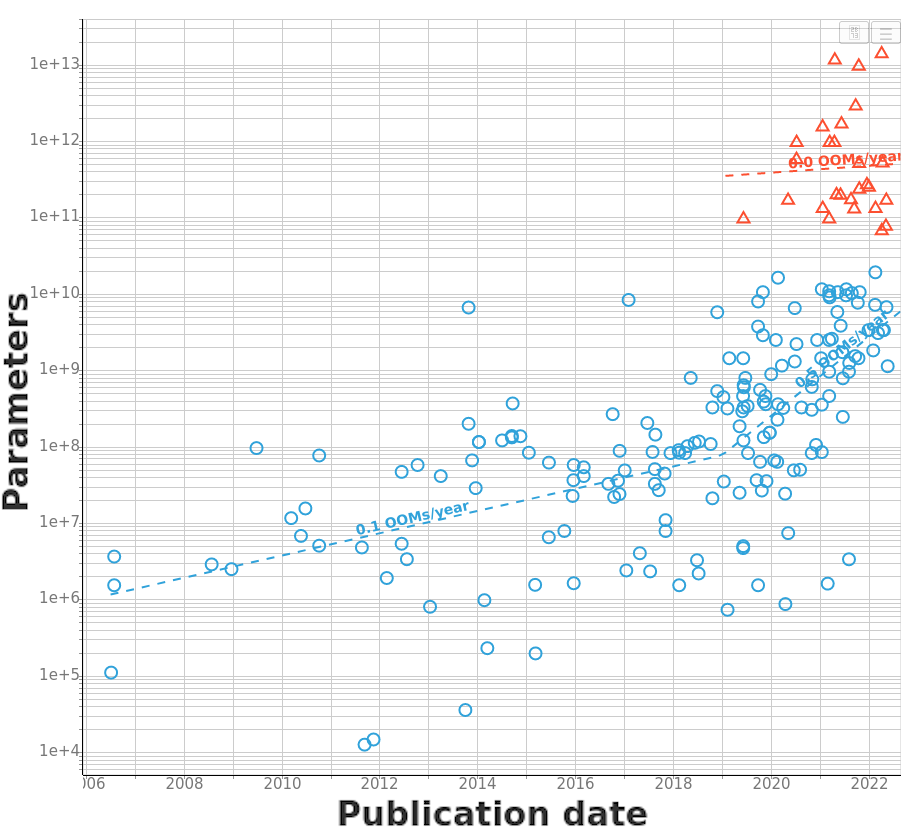 - GPT-3 initiated the gap by ‘jumping’ one order of magnitude in size over previous systems. This gap was maintained because researchers are incentivized to build the cheapest model that can outperform previous models. Those competing with GPT-3 are above the gap; the rest are below.