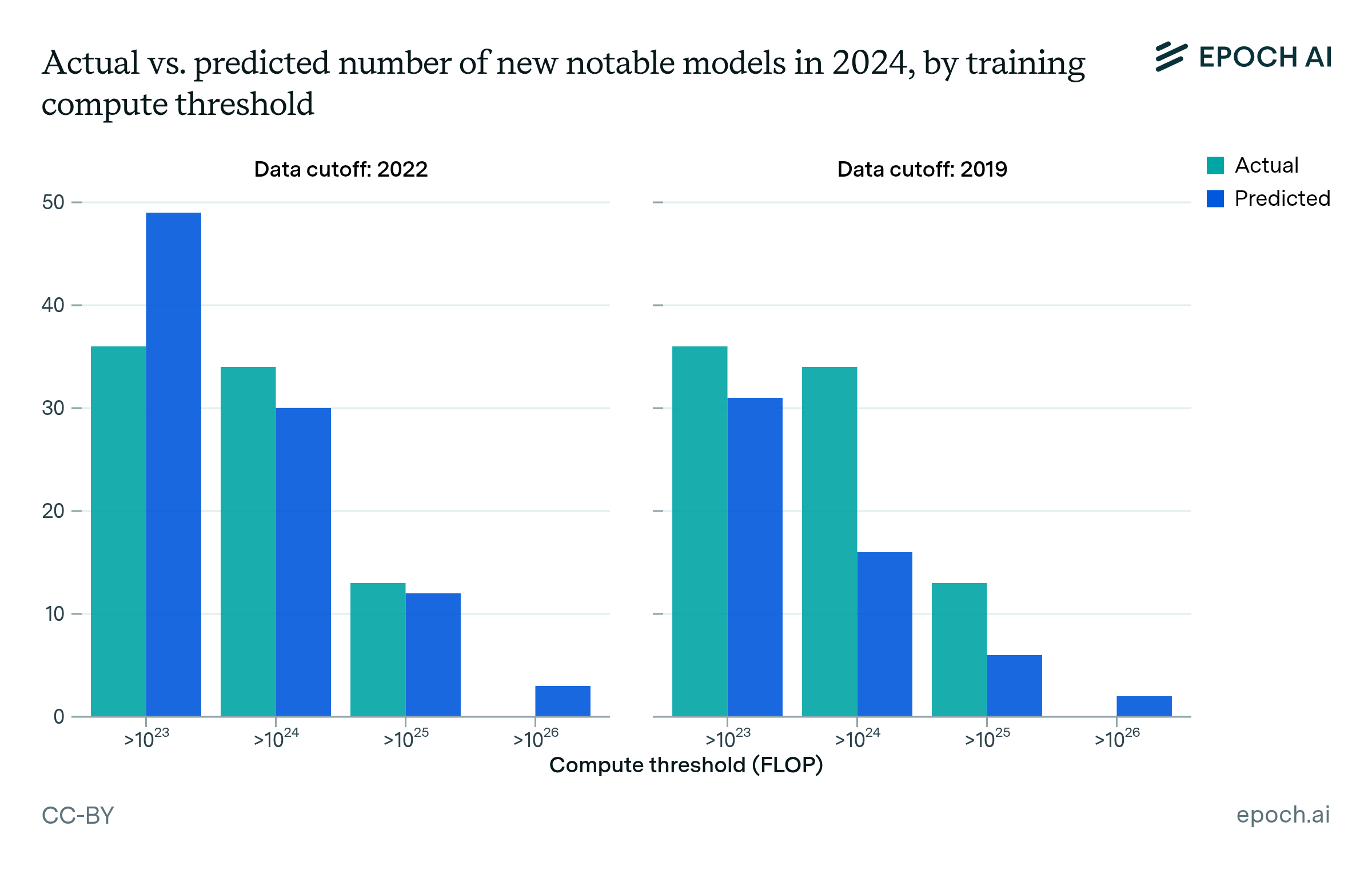 To evaluate the projective model’s calibration and generalisation, we backtested the model on historical data. When backtesting, we simply extrapolate the average trend in training compute, rather than rederiving it from hardware investment and the distribution of training compute. This extrapolation is based only on historical data up to some cutoff point, e.g. 2022. We then evaluate how well the extrapolation predicts model counts after that cutoff point, e.g. in 2024. We compare the predicted vs. actual number of new models each year, since that is what the extrapolation directly predicts.
