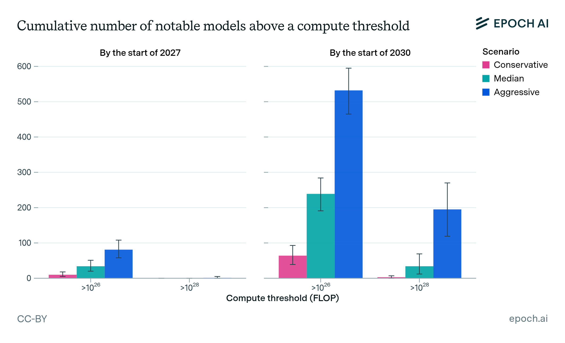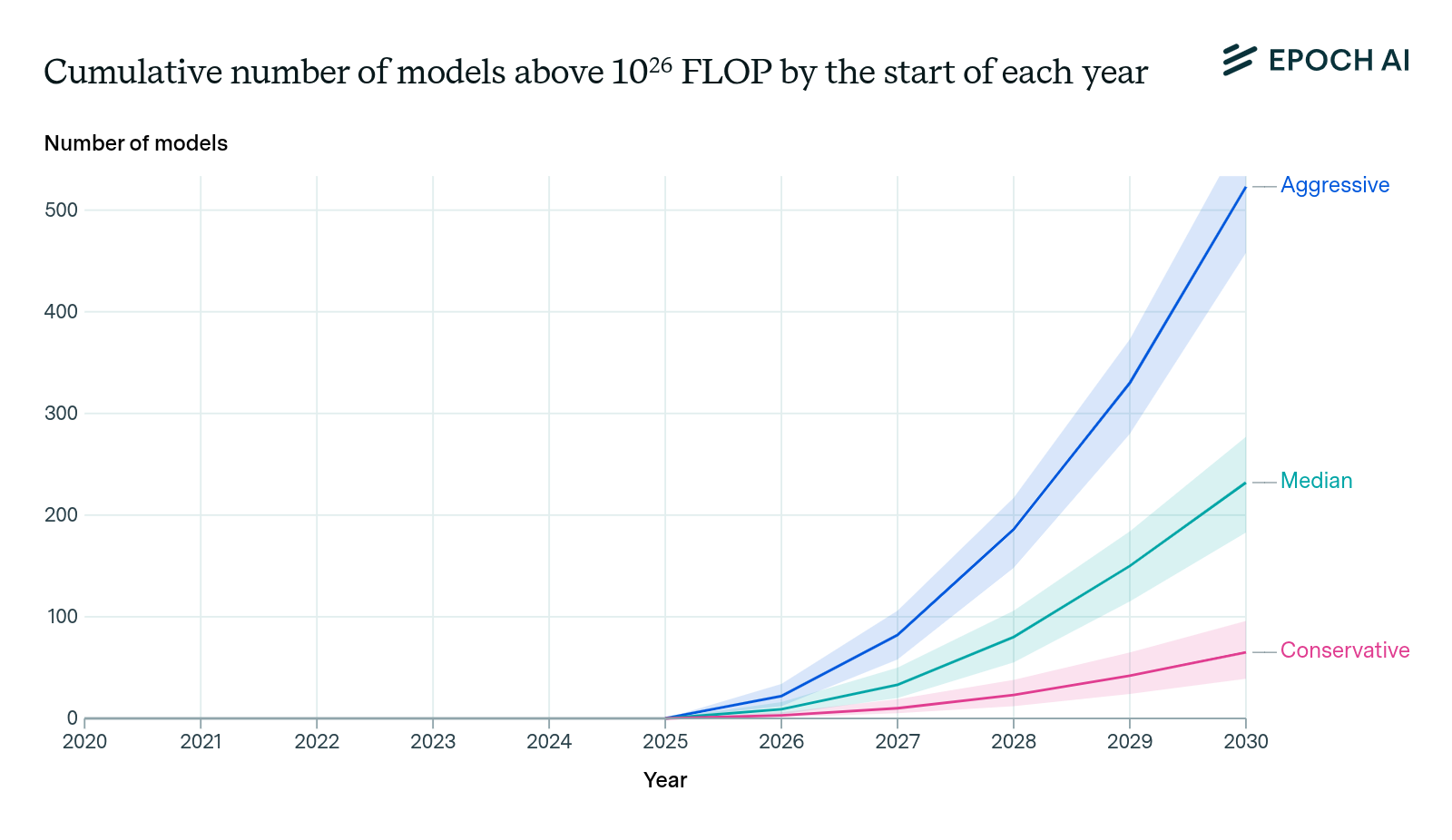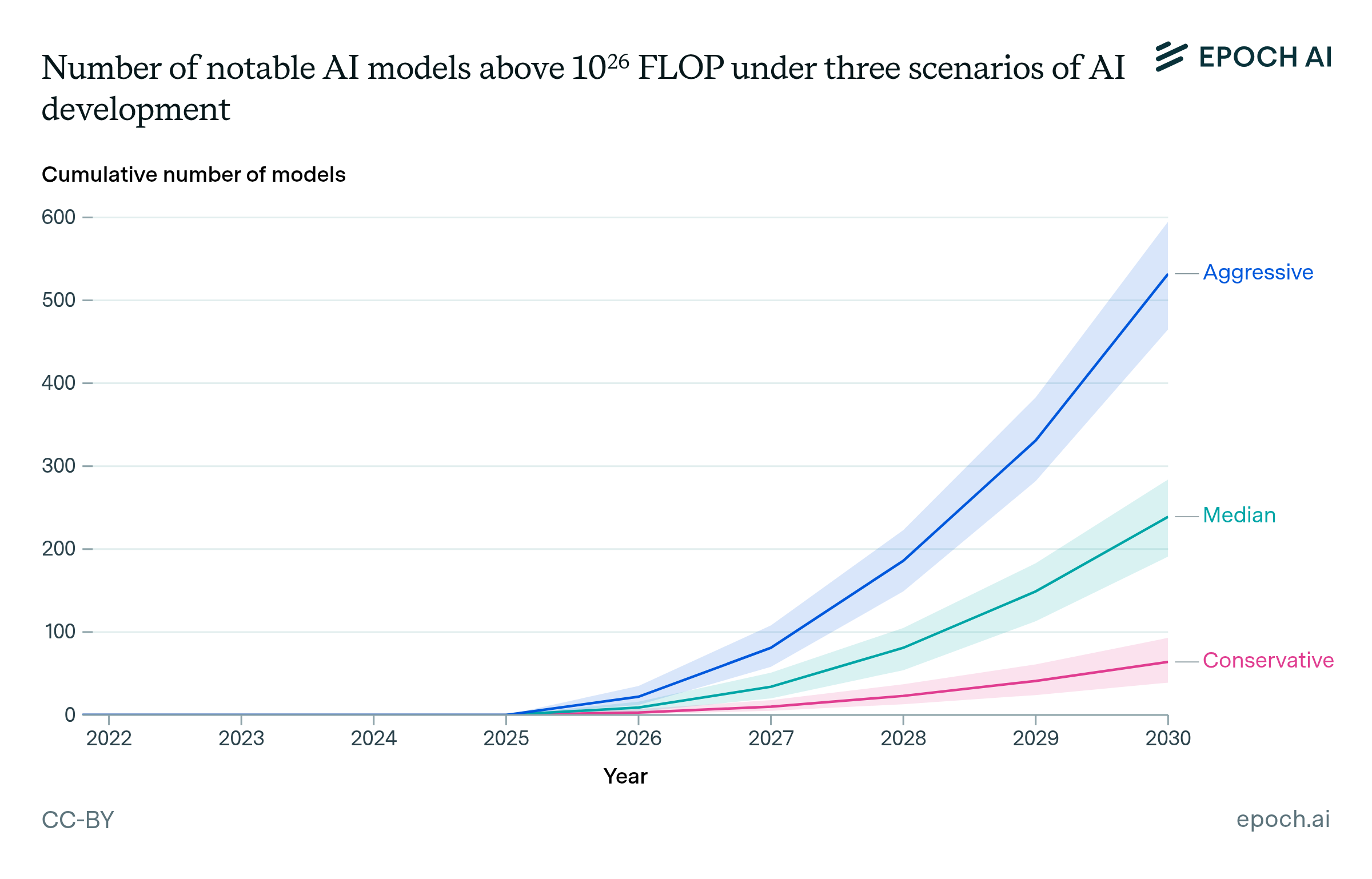 Figure 2: The number of AI models above 1026 FLOP, comparing the median extrapolation to two alternative scenarios. The “conservative” and “aggressive” scenarios represent plausible extremes in the model counts. The counts accelerate across all scenarios, reaching tens to hundreds of models by 2030. Shaded regions indicate 80% confidence intervals, which reflect uncertainty in model inputs that do not vary between scenarios: hardware price-performance, training run duration, and the distribution of compute over AI models. Note: these projections are likely to be smaller than total model counts as a compute threshold falls further behind the frontier, since lower-compute models are less likely to meet Epoch AI’s notability criteria or be publicly documented.
