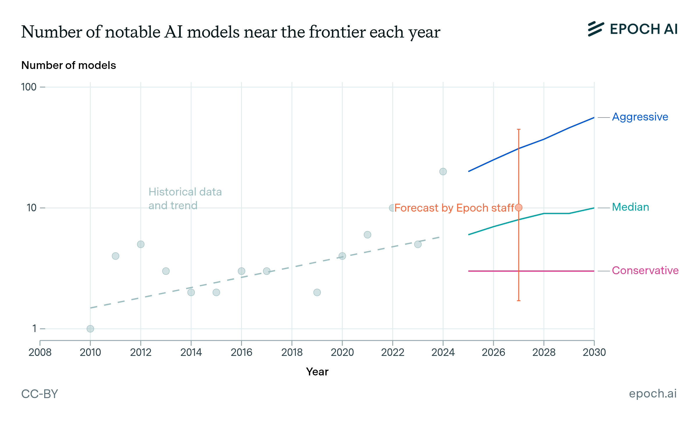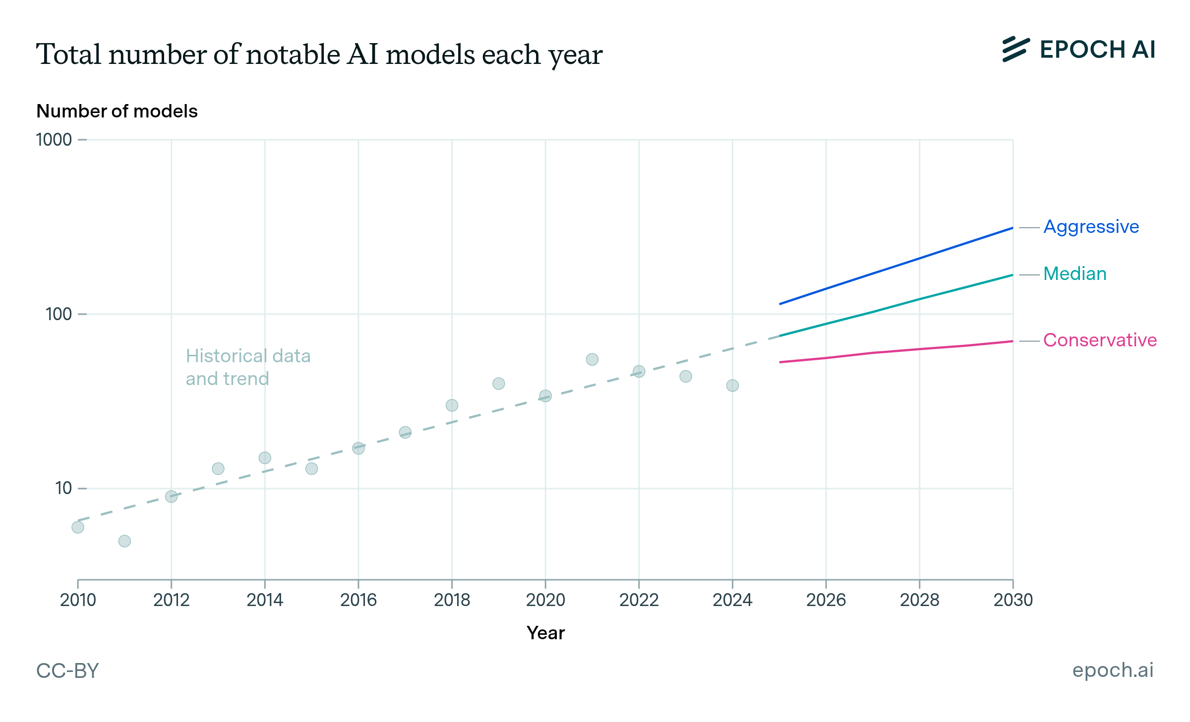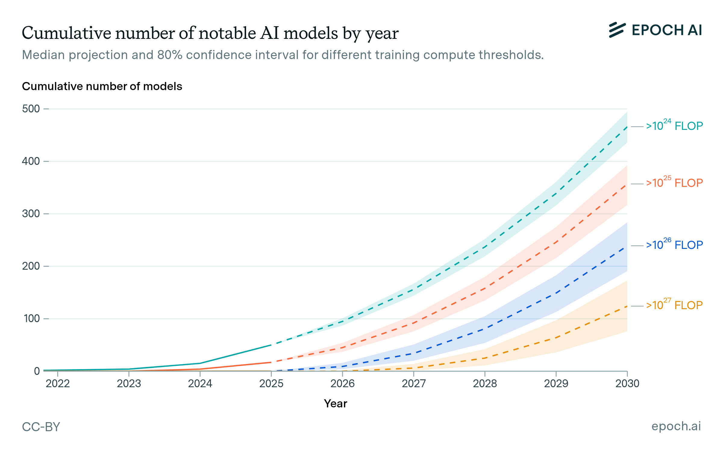 Figure 2: The number of AI models above 1026 FLOP, comparing the median extrapolation to two alternative scenarios. The “conservative” and “aggressive” scenarios represent plausible extremes in the model counts. The counts accelerate across all scenarios, reaching tens to hundreds of models by 2030. Shaded regions indicate 80% confidence intervals, which reflect uncertainty in model inputs that do not vary between scenarios: hardware price-performance, training run duration, and the distribution of compute over AI models. Note: these projections are likely to be smaller than total model counts as a compute threshold falls further behind the frontier, since lower-compute models are less likely to meet Epoch AI’s notability criteria or be publicly documented.