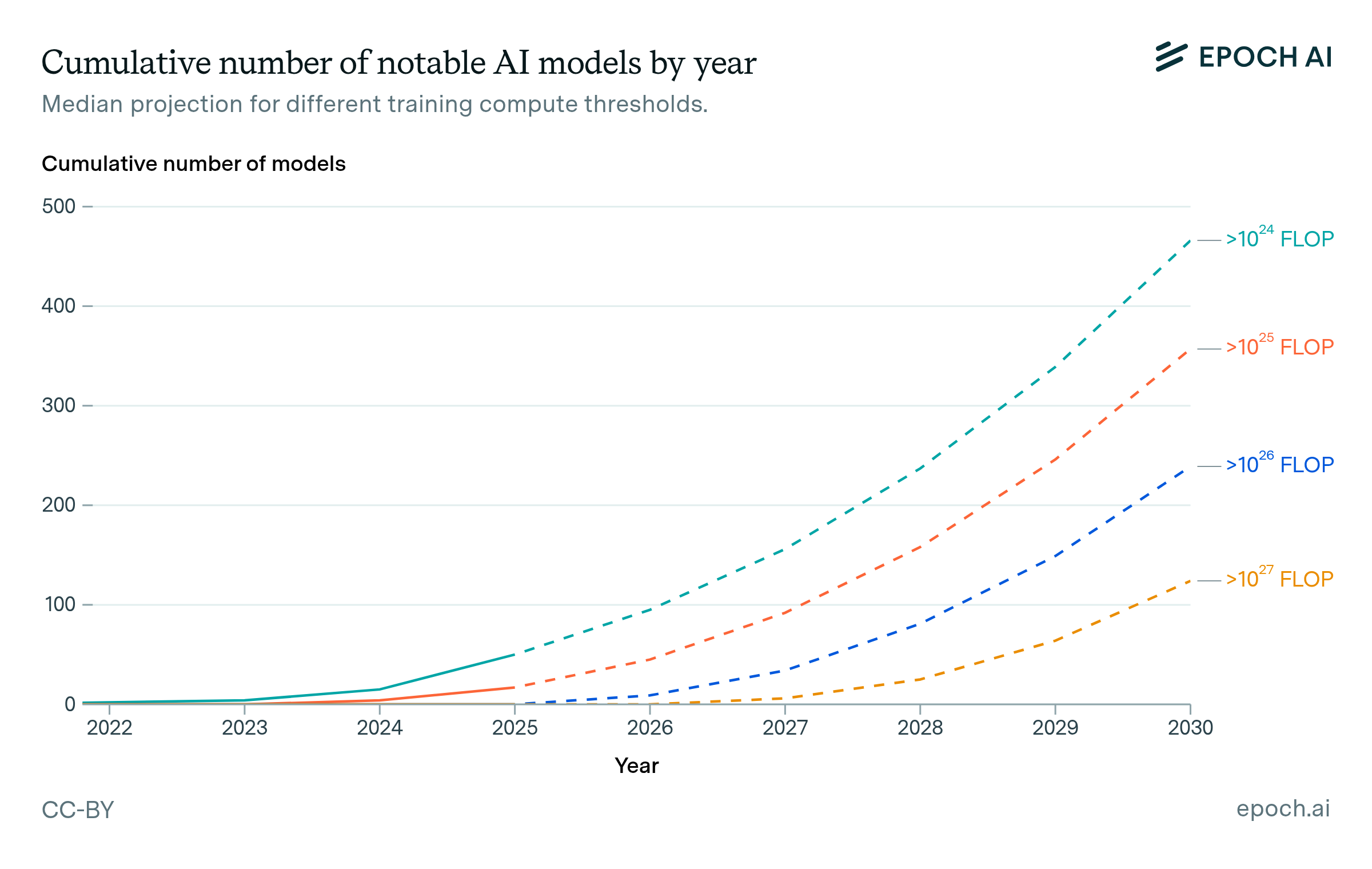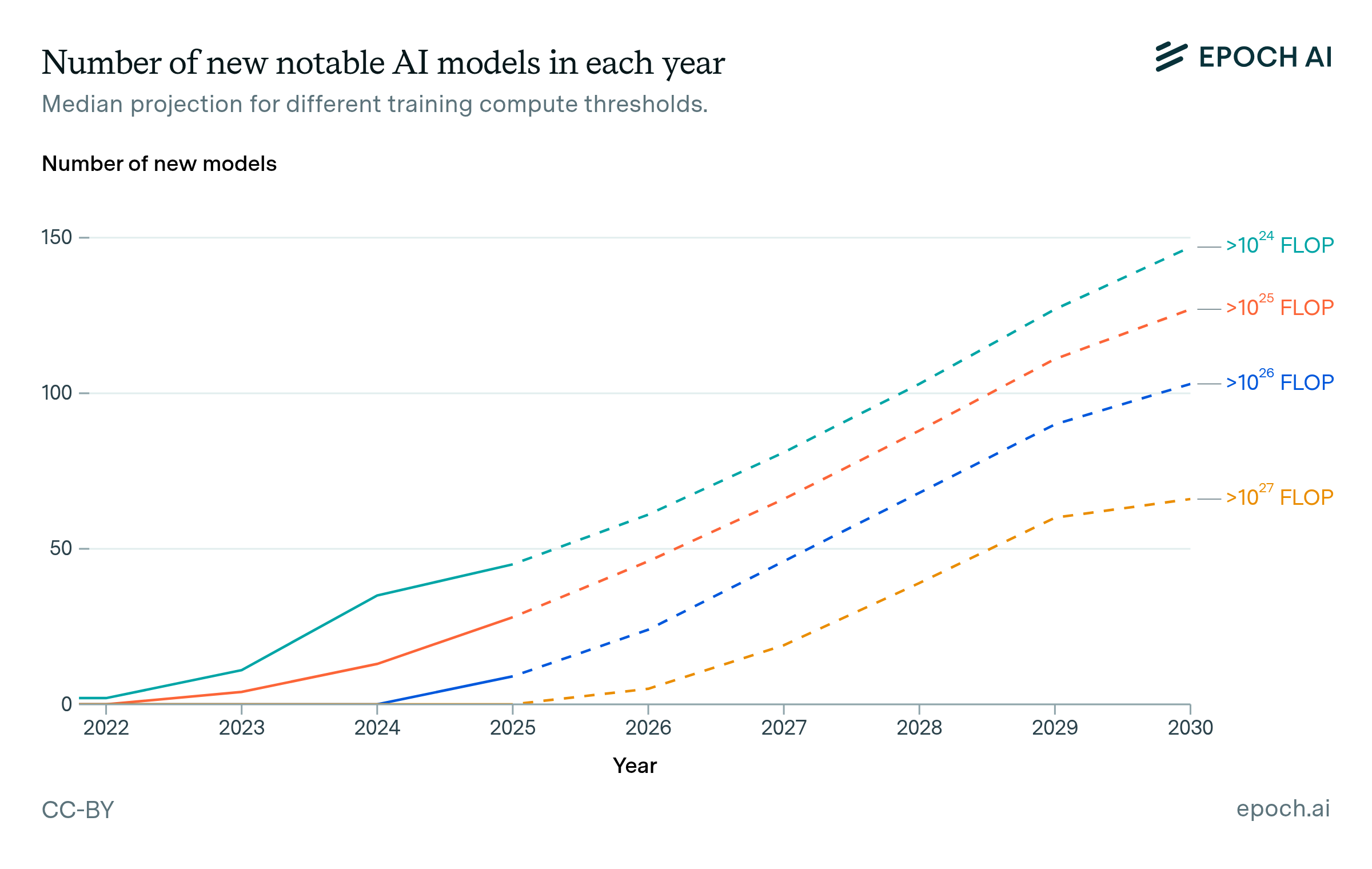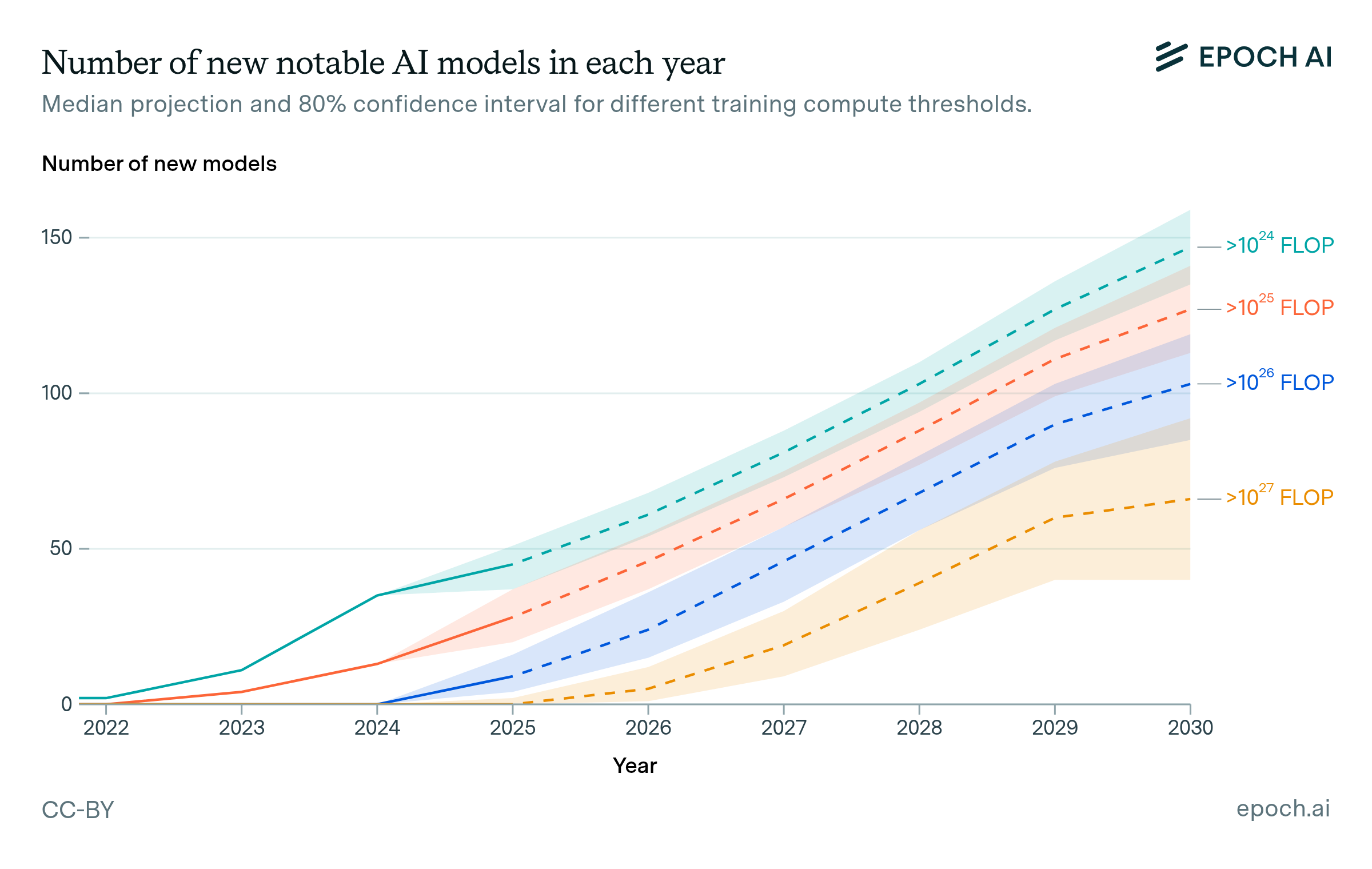 Figure 1: Median projection for future notable AI model releases with different levels of compute, by year. Note: these projections are likely to be smaller than total model counts as a compute threshold falls further behind the frontier, since lower-compute models are less likely to meet Epoch AI’s notability criteria or be publicly documented.