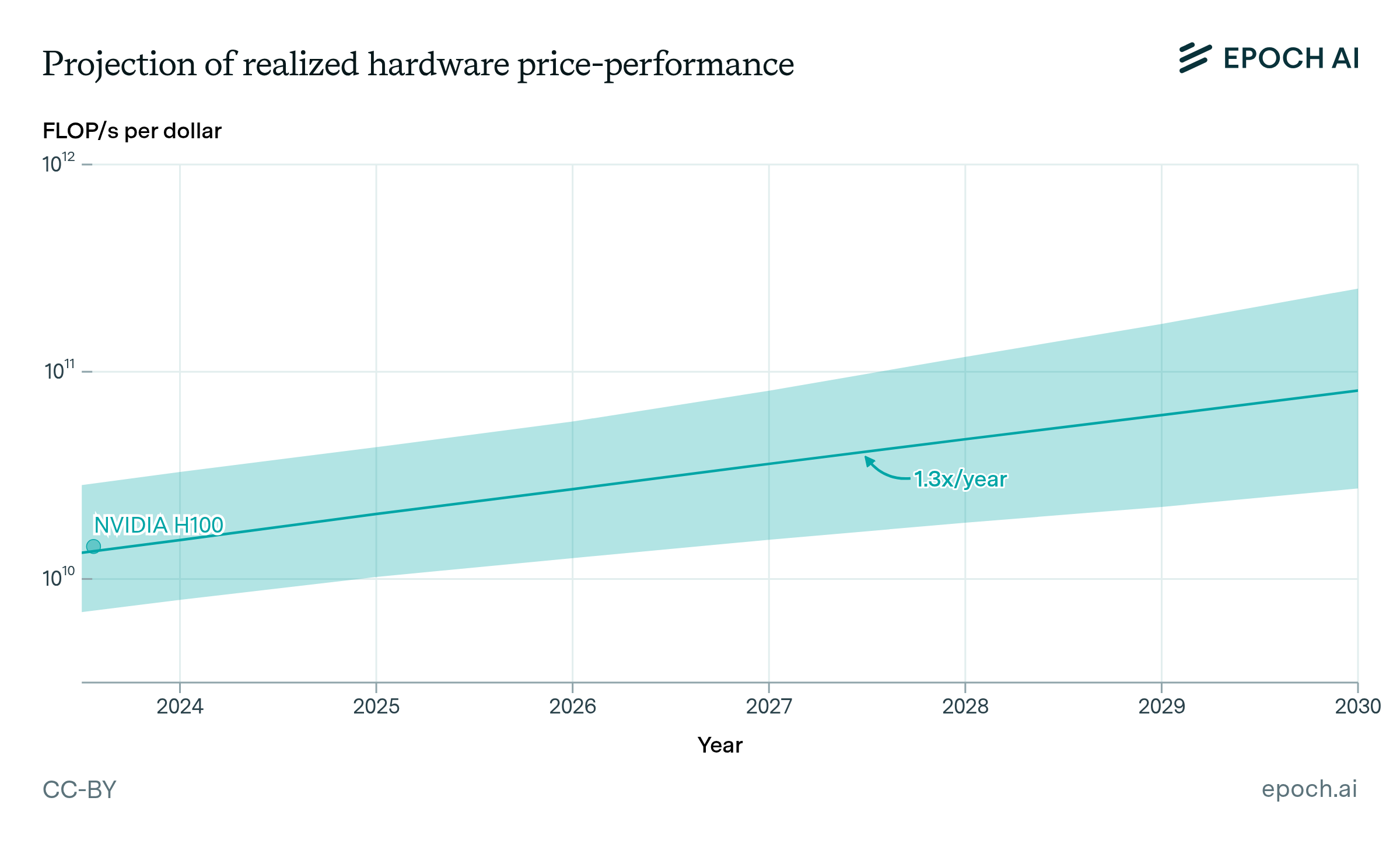 We extrapolate hardware performance at about 1.4x/year based on the historical trend in the performance of leading ML hardware. A confidence interval of 1.3–1.6x/year accounts for uncertainty in this trend, as well as potential gains in performance from a potential drop to 8-bit and even 4-bit precision. To calculate price-performance we divide performance by the hardware purchase price, starting at about $24–48k for the H100, which includes server and networking costs per chip. This price grows at 1.0–1.2x/year based on the historical trend in ML hardware prices over time, as reported in this data hub (filtering Cerebras CS-2 and CS-3 as outliers). The resulting projection of price-performance grows at 1.3x/year in the median case. This is close to an estimate of 1.4x/year from previous work (which was reported as a doubling time of 2.1 years).