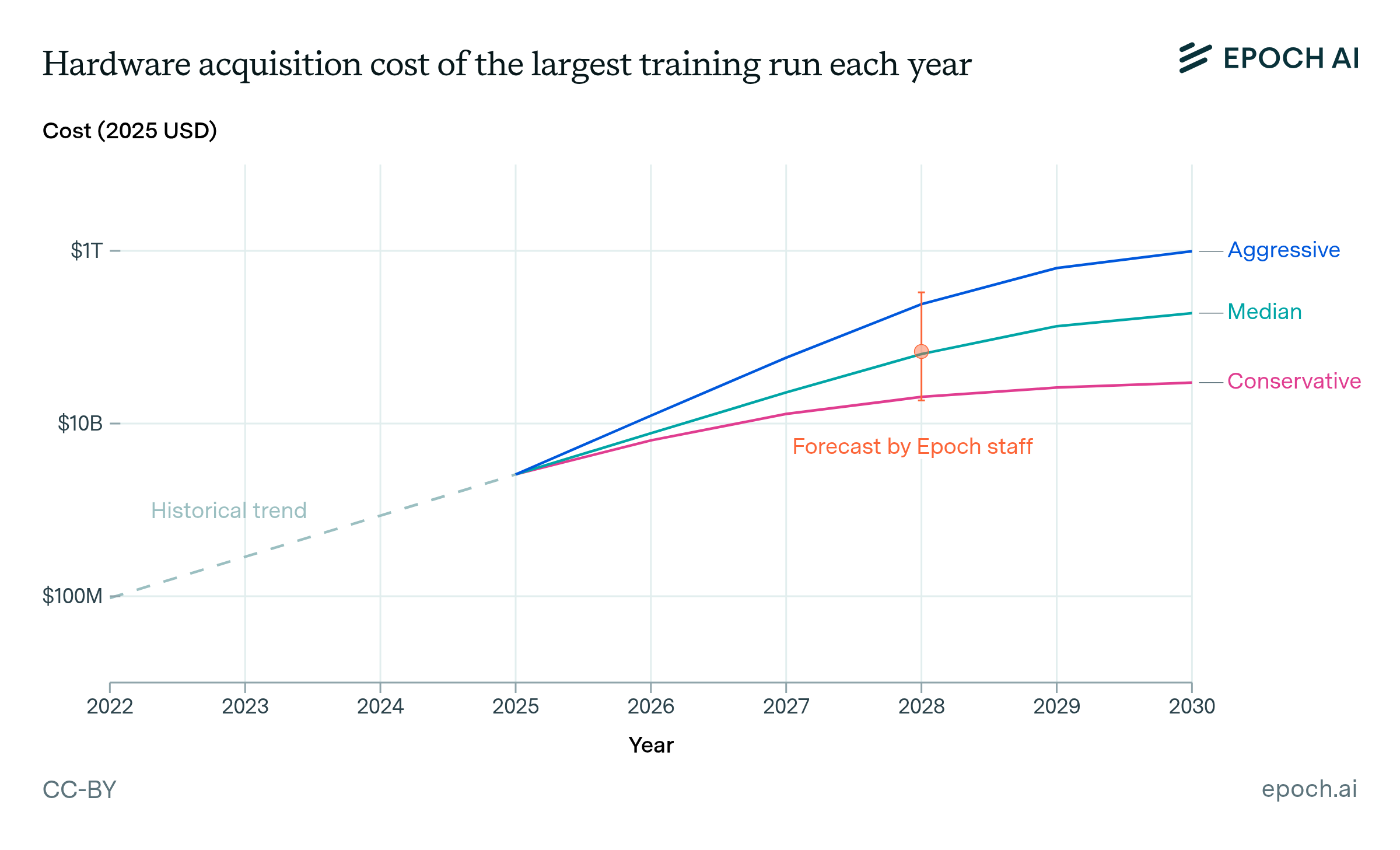 We extrapolate from approximately $3 billion at the start of 2025, which roughly matches the cost of leading AI supercomputers at the time. For example, “xAI Colossus Memphis Phase 1”, which trained the Grok-3 model, cost an estimated $4 billion. ↩