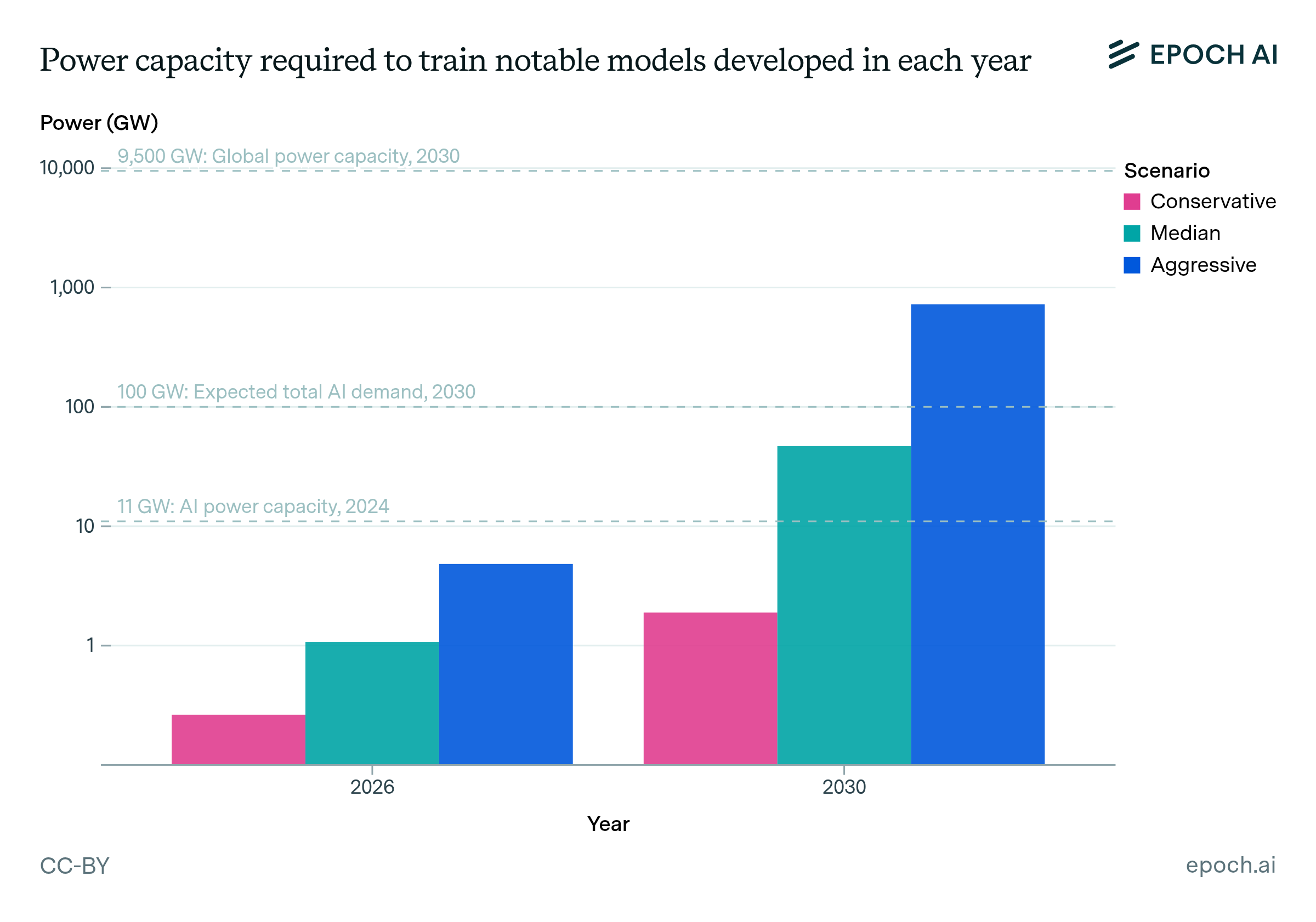 By 2030, the total power demand implied by our projections increases to around 50 GW for the median scenario, and 700 GW for the aggressive scenario. For context, 50 GW is roughly the net Summer capacity of the state of Pennsylvania. Given that projections center around 100 GW globally for total AI power demand in 2030, having half of this allocated to training seems feasible. To reach 700 GW in the aggressive scenario would require a much faster and more distributed buildout than expected. The highest estimate of total power demand in this RAND report is also around 700 GW. So the aggressive scenario requires that (a) supply will match this high-demand scenario, and (b) almost all of this capacity is allocated to training, rather than research or inference. We believe this is plausible but unlikely.