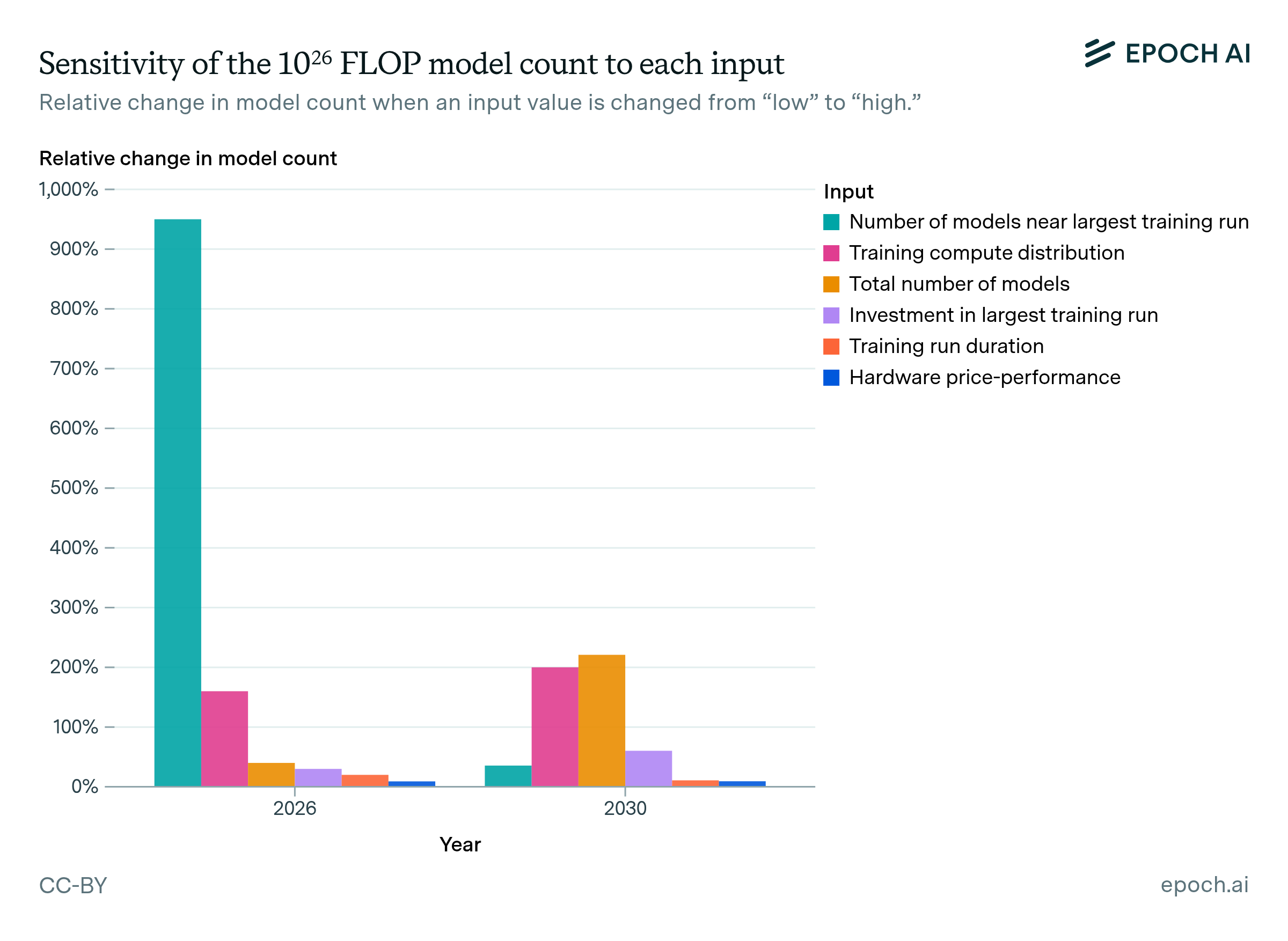 We performed a sensitivity analysis of our model to assess its robustness and identify inputs that deserved more careful analysis. We measured sensitivity by varying one input between two extremes (either the “conservative” and “aggressive” scenario values, or 10th and 90th percentiles), while holding other inputs constant. We then calculated the relative change in the predicted number of models above 1026 FLOP. The relative changes are shown in Figure 11, indicating how sensitive the results are to each input.