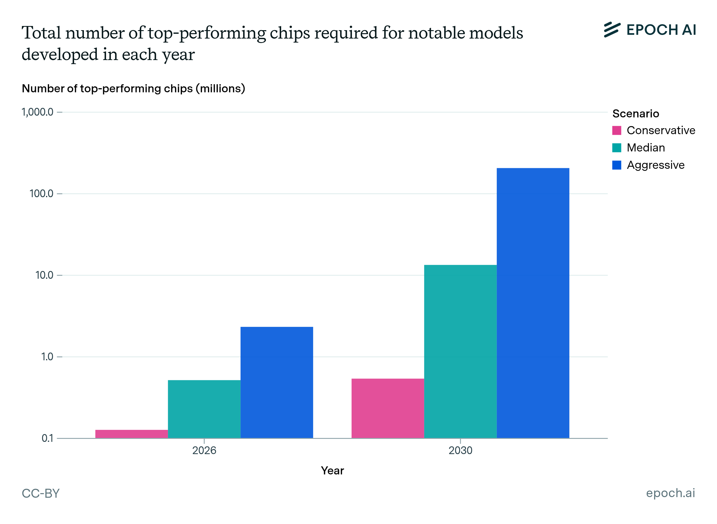 Figure A3: Total number of top-performing chips required to train all of the AI models predicted to exist in each year, in each scenario of AI development. The number of top-performing chips is calculated by dividing total training FLOP by the number of seconds per year, then dividing that by the best achievable hardware performance at the time. This accounts for performance improvements over time.