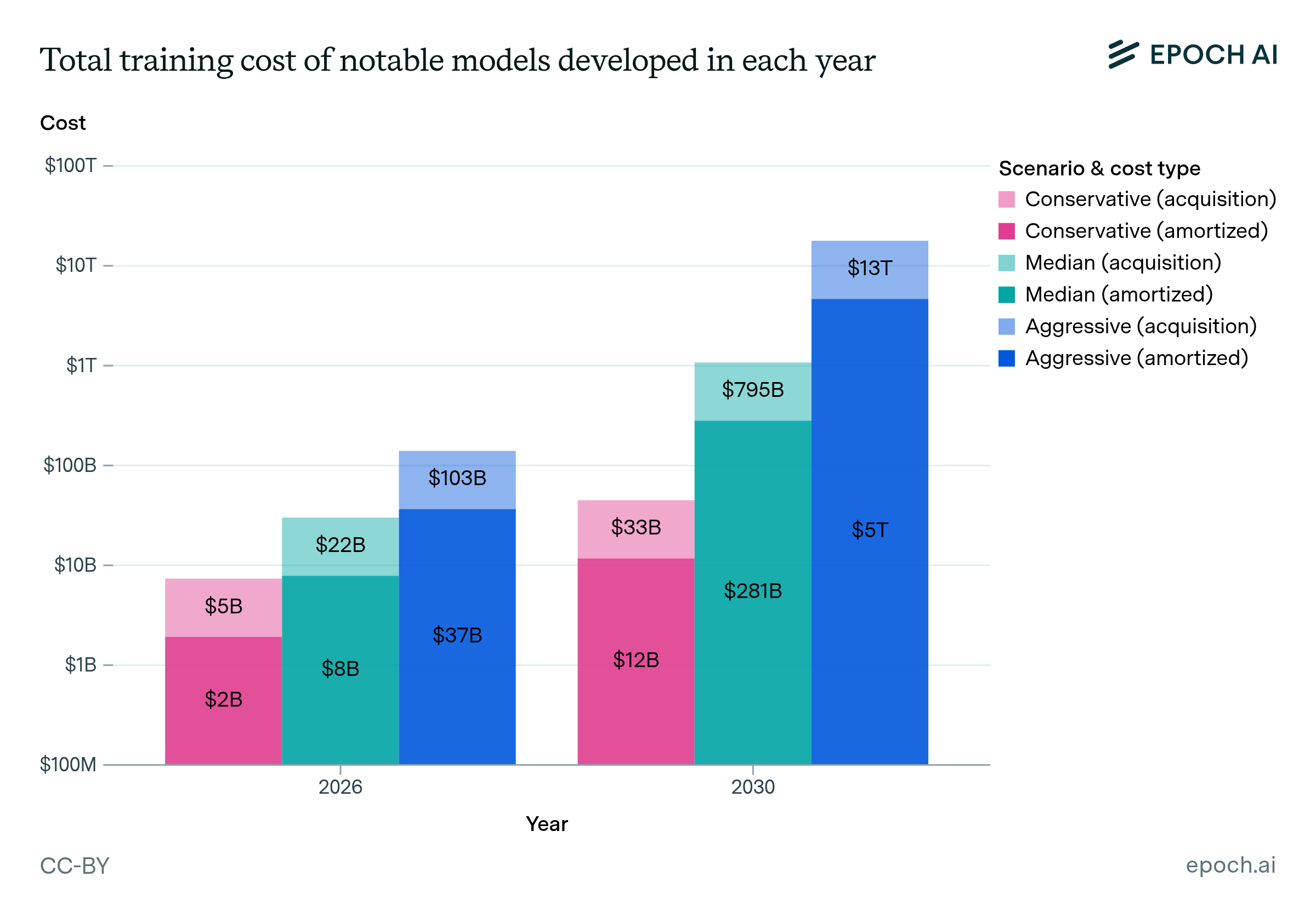 The aggressive scenario instead assumes that AI development is both lucrative and widely distributed in the next few years. It predicts 528 models above 1026 FLOP models by 2030. In this scenario, investment booms on the back of accelerating AI progress, but still becomes constrained by power supply and available capital, reaching about $1 trillion for the largest hardware cluster by 2030. Investment is also more distributed across models, with over 50 models near the frontier in 2030, and over 300 notable models in total.